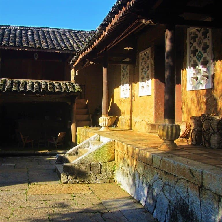 A timber, tile & rammed-earth structure encircling a stone courtyard surrounded by a stone wall with haunting limestone peaks looming all around, the Auberge de Meo Vac is a remarkably atmospheric place to stay in Vietnam’s northernmost province, Ha Giang….