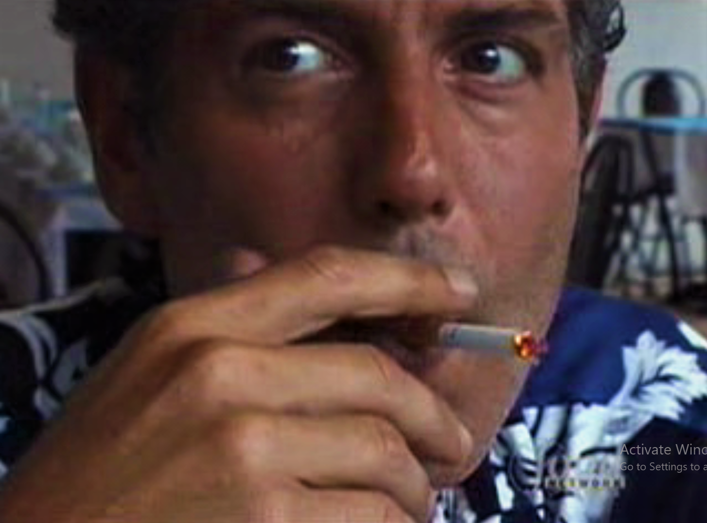 Screenshot: Bourdain smokes after finishing his multi-course cobra meal in Saigon (Ho Chi Minh City).