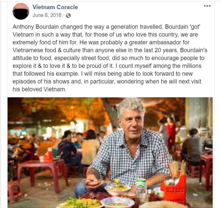 Like a lot of people, I was surprised by how much Bourdain’s death affected me. For a long time I found I couldn’t re-watch or enjoy any of his shows: it was just too sad. I remember where I was when I heard he had died: in the dining car of a train rattling through the night from Quy Nhon to Saigon, having spent the week researching a guide to the beaches of the central coast. Shocked and saddened, I returned to my sleeping compartment and wrote a brief tribute to Bourdain on the Vietnam Coracle Facebook page. As a testament to how much he means to people with an interest in Vietnam, that Facebook post reached some 50,000 people, more than any other I’d posted previously or since.