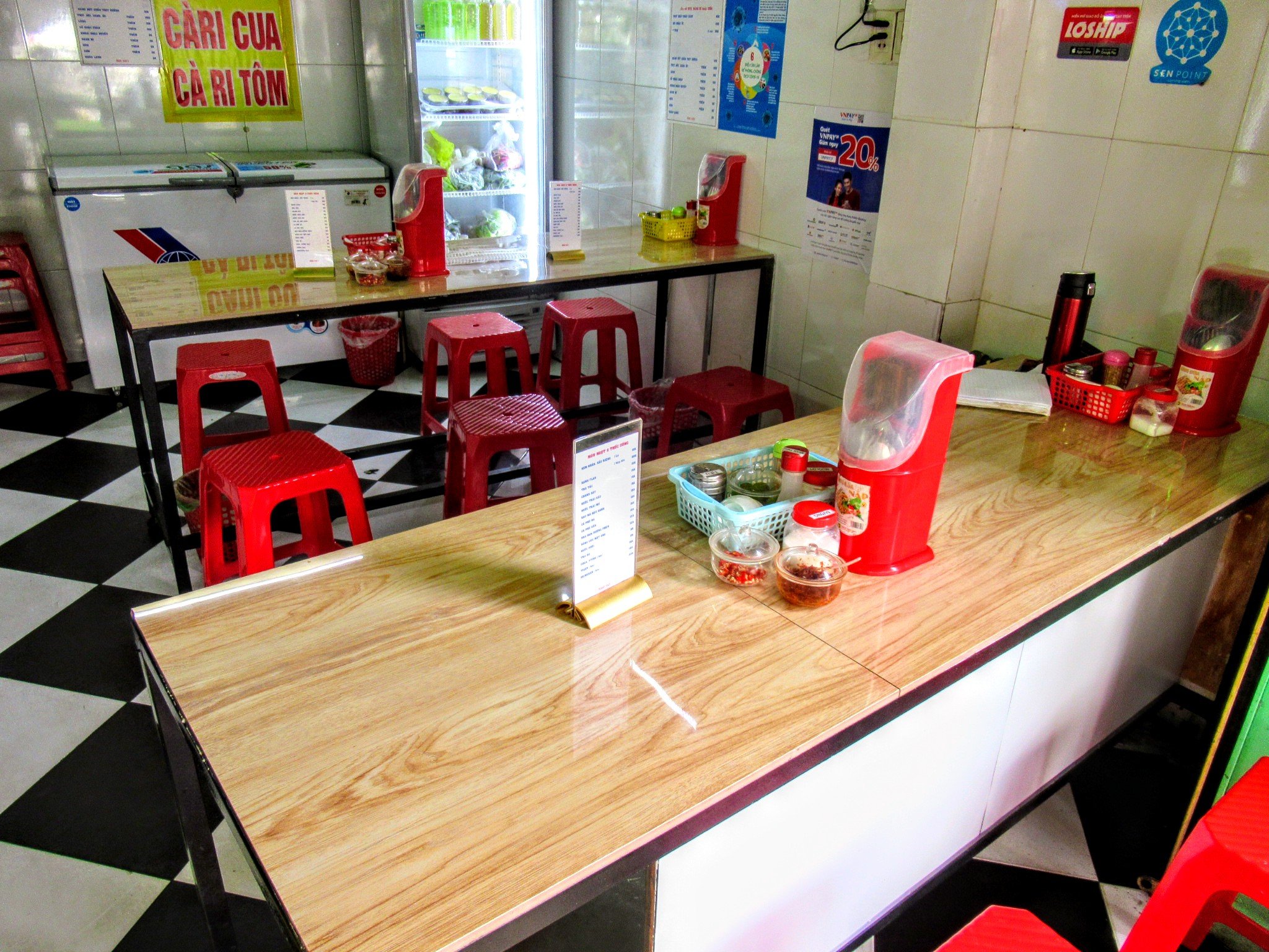 In downtown Saigon’s District 1, Bun Rieu Cua Oc Phan Rang-Ninh Thuan is a small soup house located on Nguyen Thai Binh Street. Among an attractive grid of streets filled with hardware stores and French colonial-era shophouses, I stumbled upon Bun Rieu Cua Oc Phan Rang-Ninh Thuan while wandering around on a hot and humid rainy season afternoon. Feeling hungry, I was trying to find somewhere local to eat (a difficult task these days in downtown Saigon, where chains and brands increasingly rule the roost). Standing out with its yellow facade in a row of Saigon townhouses, Bun Rieu Cua Oc Phan Rang-Ninh Thuan caught my eye. Although the exterior looks as though it’s been built with giant Lego blocks, the interior is typical of many Vietnamese soup houses: sparse but clean, with wall fans cooling diners sitting on metallic chairs at tables. One of the reasons I was attracted to this place were the words ‘Ninh Thuan’, a province on the south-central coast, and one of my favourite regions in Vietnam. Indeed, Bun Rieu Cua Oc Phan Rang-Ninh Thuan is a modest chain of sorts: the original soup house is in Phan Rang city, provincial capital of Ninh Thuan, and has been running for 17 years; the Saigon branch – the only other – has been operating for 6 years.