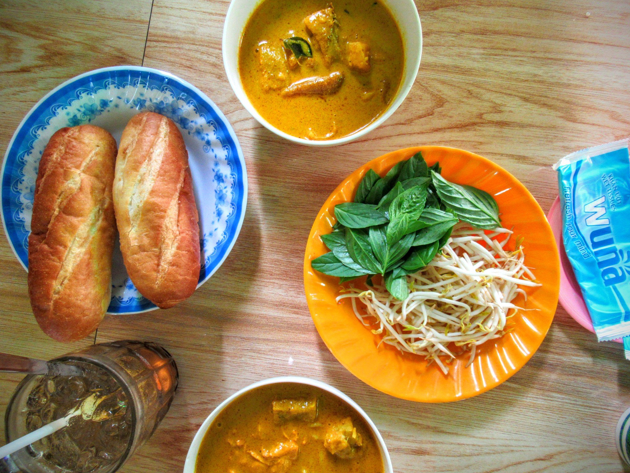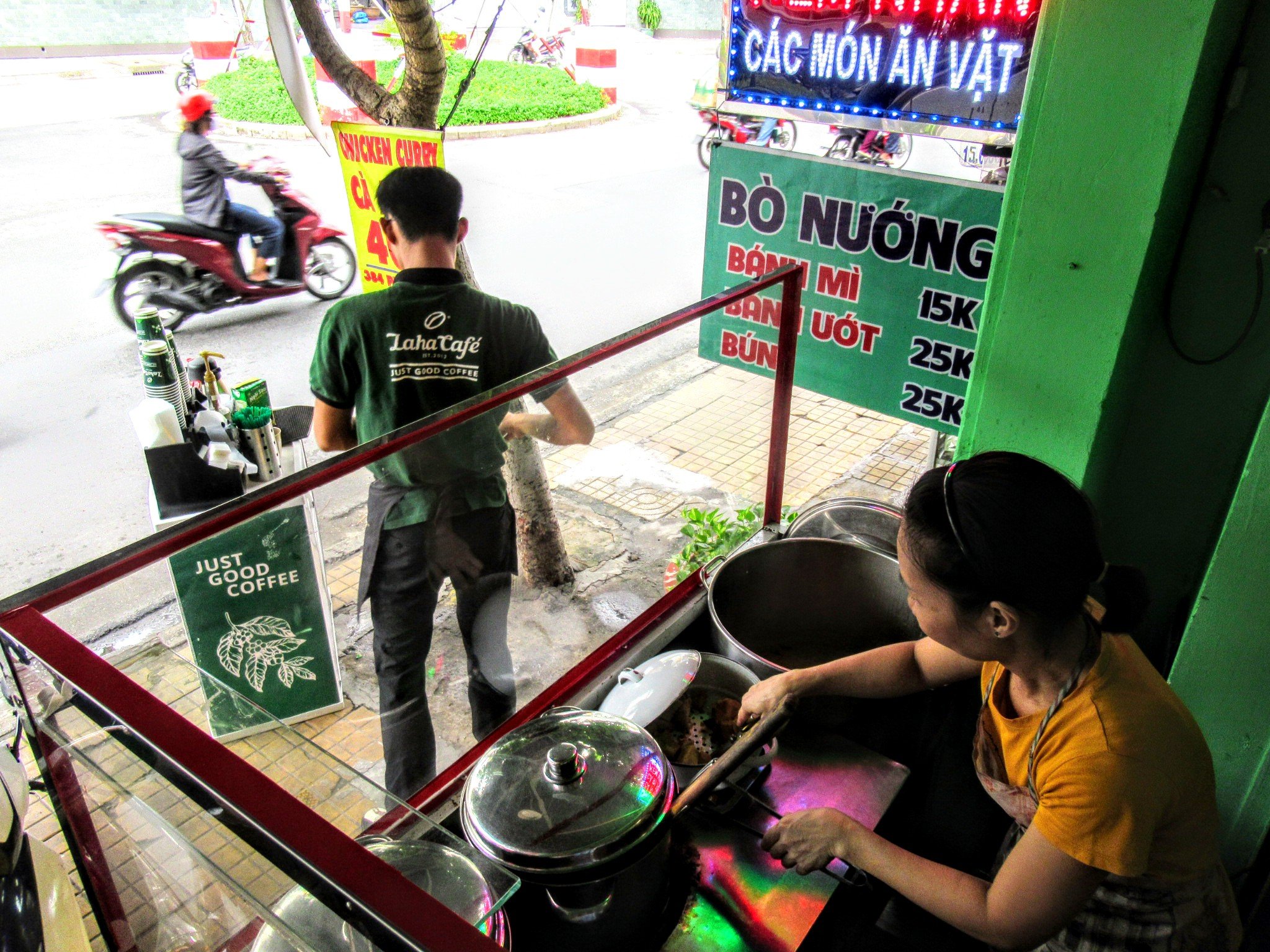 Into the broth, you can choose from a number of accoutrements, including red chilli paste, finely sliced green chillies, salty fish sauce, a squeeze of lime, a dollop of mắm tôm (pungent, fermented shrimp paste), and a sprinkling of sugar to cut the potency of the latter. On top of this, add crisp greenery for extra crunch, flavour, and nutritional value: shredded morning glory, banana blossom, bean sprouts, and watermint. Stir it all in with chopsticks and a spoon, and you’re good to go. It’s a world of textures and flavours; each mouthful a little different from the last: fishy, salty, sour, sweet, hearty, and refreshing. A bowl of bún riêu cua ốc costs between 55,000-65,000vnd ($2-$3).