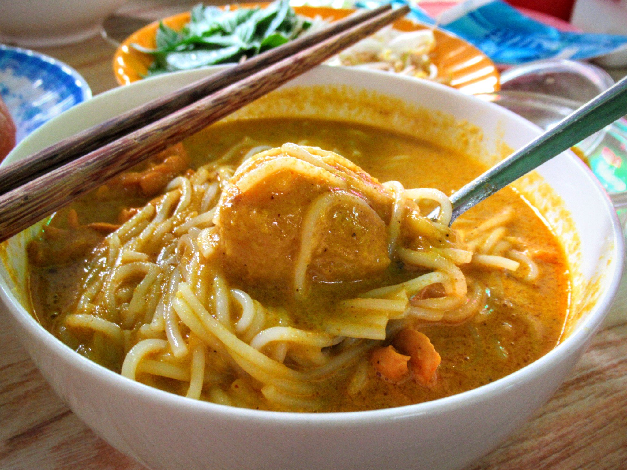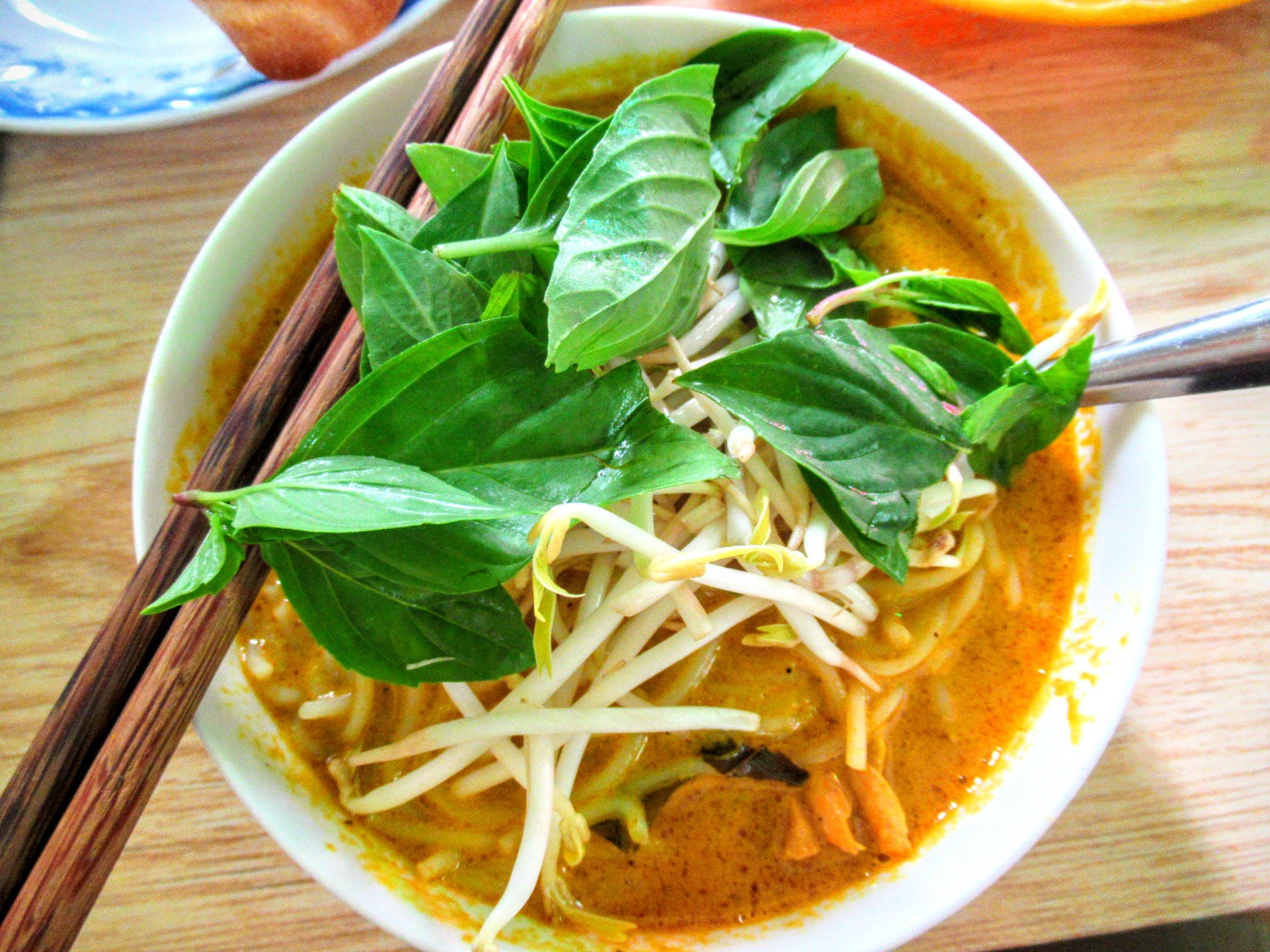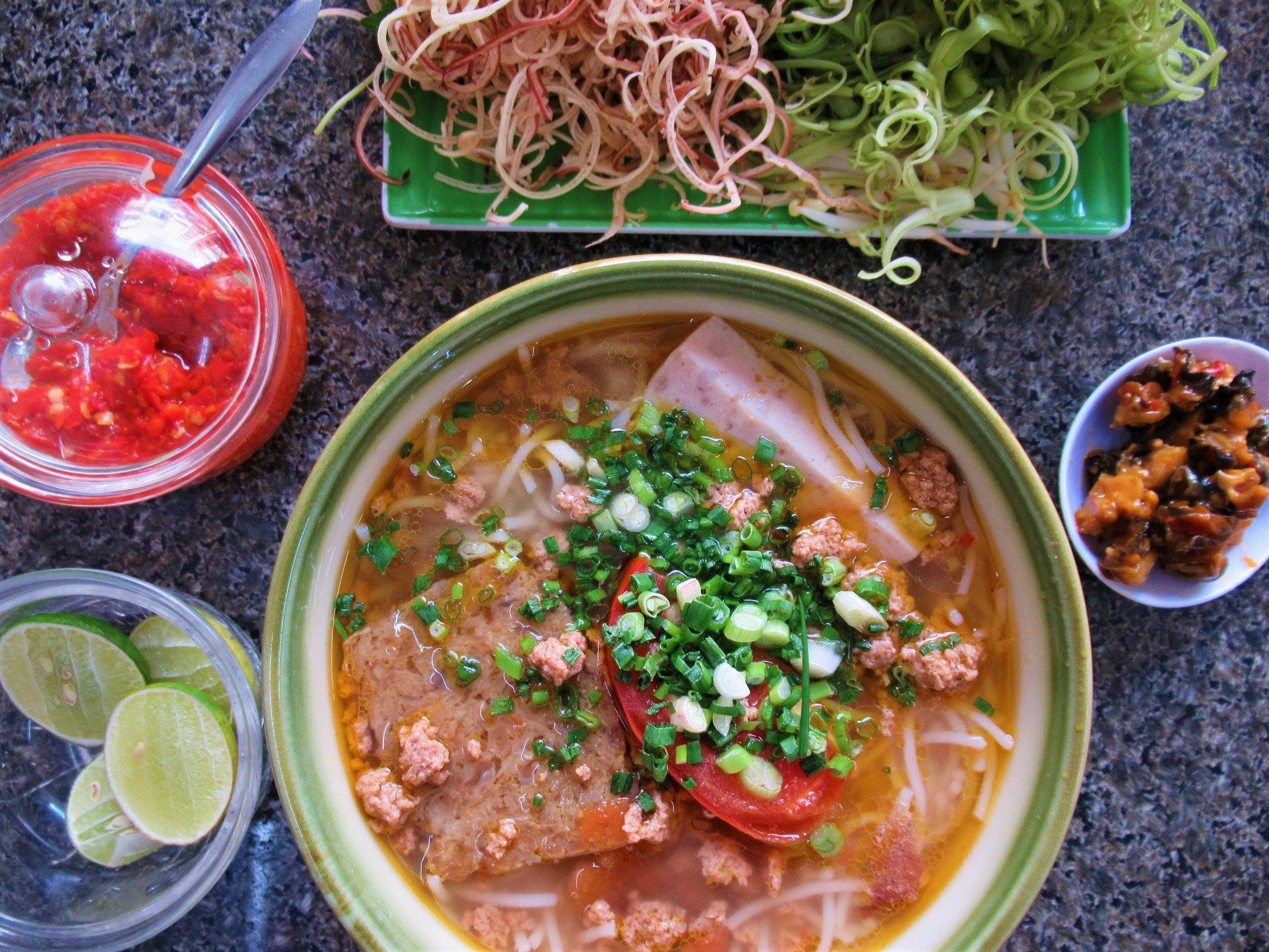 A deep, reddish broth made from tomatoes and pulverized crab, poured over white rice noodles, topped with marinated snails and crab cake, and garnished with fresh herbs and leaves, bún riêu cua ốc is one of those Vietnamese soups that jumps out at you from the bowl. Despite being one of the most ubiquitous street food dishes in Vietnam, bún riêu cua ốc doesn’t s have the same broad appeal among travellers and expatriates as other Vietnamese noodle soups. But, bún riêu cua ốc is a favourite among locals, which, Vietnam being a nation of discerning foodies, is a sign that you should take the dish seriously, however strange it might initially be to your palate. You may find you have to ‘work’ a little before acquiring a taste for bún riêu cua ốc, but this just makes it all the more rewarding when, finally, everything clicks and the dish makes sense. If you’re new to this dish, then Bun Rieu Cua Oc Phan Rang-Ninh Thuan, in downtown Saigon (Ho Chi Minh City), is a good place to start, because it serves a relatively mild – but genuine – version of the soup, that’s a good training ground for your taste buds to learn the pleasures of bún riêu cua ốc.