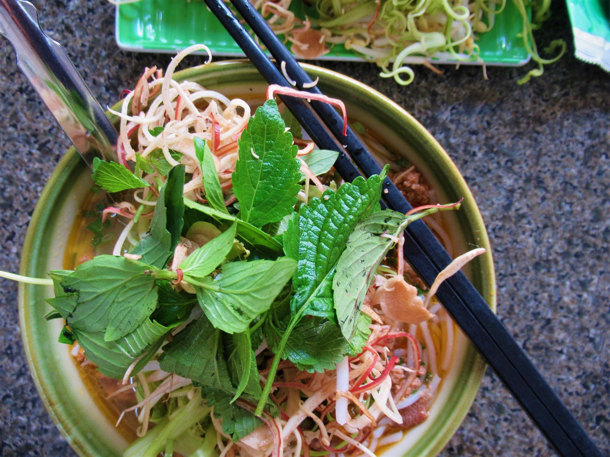 The richness of the crab is balanced by the sweet-sour of the tomatoes, and yet more sourness comes through with the addition of tamarind and rice vinegar to the broth. The earthy-amber colour of the stock – from the crab and tomatoes – is further reddened by annatto seeds, which are often used as a natural food colouring, but also impart a subtle yet distinctive fragrance. The broth is poured into thick, attractive, painted ceramic bowls over rice noodles (bún), on top of which are placed extras, such as an assortment of chả (slices of fish, pork, and crab meatloaf). When the bún riêu cua ốc arrives on the table, it looks superb: but that’s nothing surprising in Vietnam, where food presentation is an art form.