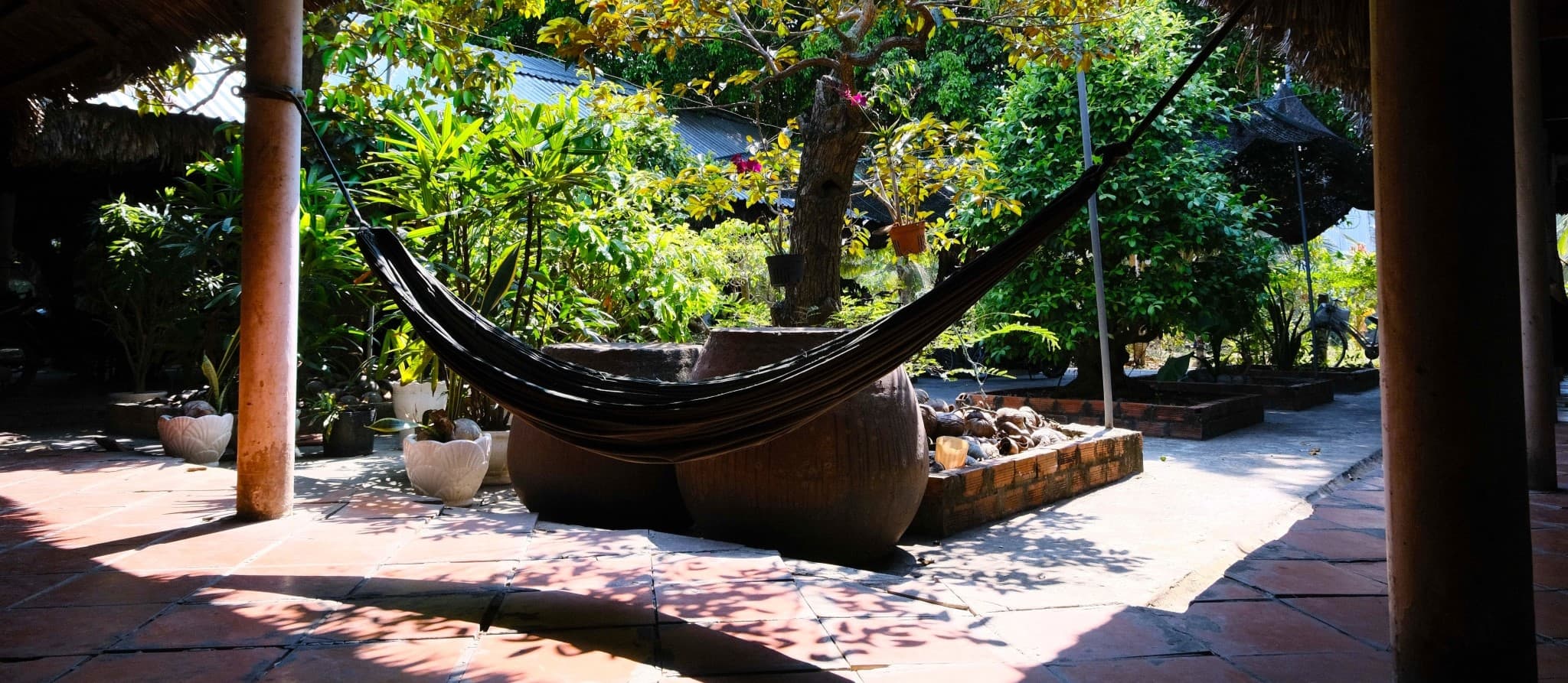 I tend to make use of hammock cafes after a few hours of riding. When looking for one, I try not to divert too far from my route. Often, I’ll try to find one with a lot of plants or trees. If my possessions aren’t safe and secure on my motorbike, I’ll try to choose a place where I can park my bike nearby my hammock. If I’m near a river or the ocean, I’ll go a bit further off the main road to find a hammock cafe near the water’s edge, in the hope of catching a breeze. If I’m in a town or city and want to leave the chaos of a busy road, I’ll sometimes use Google Maps and type ‘cà phê võng’. Search results are never entirely accurate, but it can often save me time riding around streets without finding anything. On a main road in the Mekong Delta, you’re never more than a kilometre from a hammock cafe. It should be noted that bathroom facilities aren’t always very good, particularly at the more functional and economical hammock cafes. If this is a major ‘requirement’ of your stop, it’s best to check the toilet before you settle down for a drink and a rest.