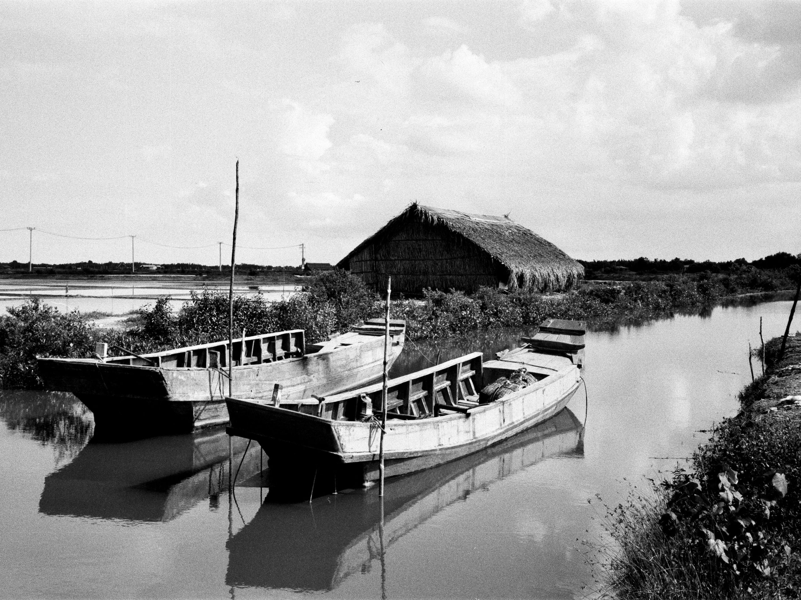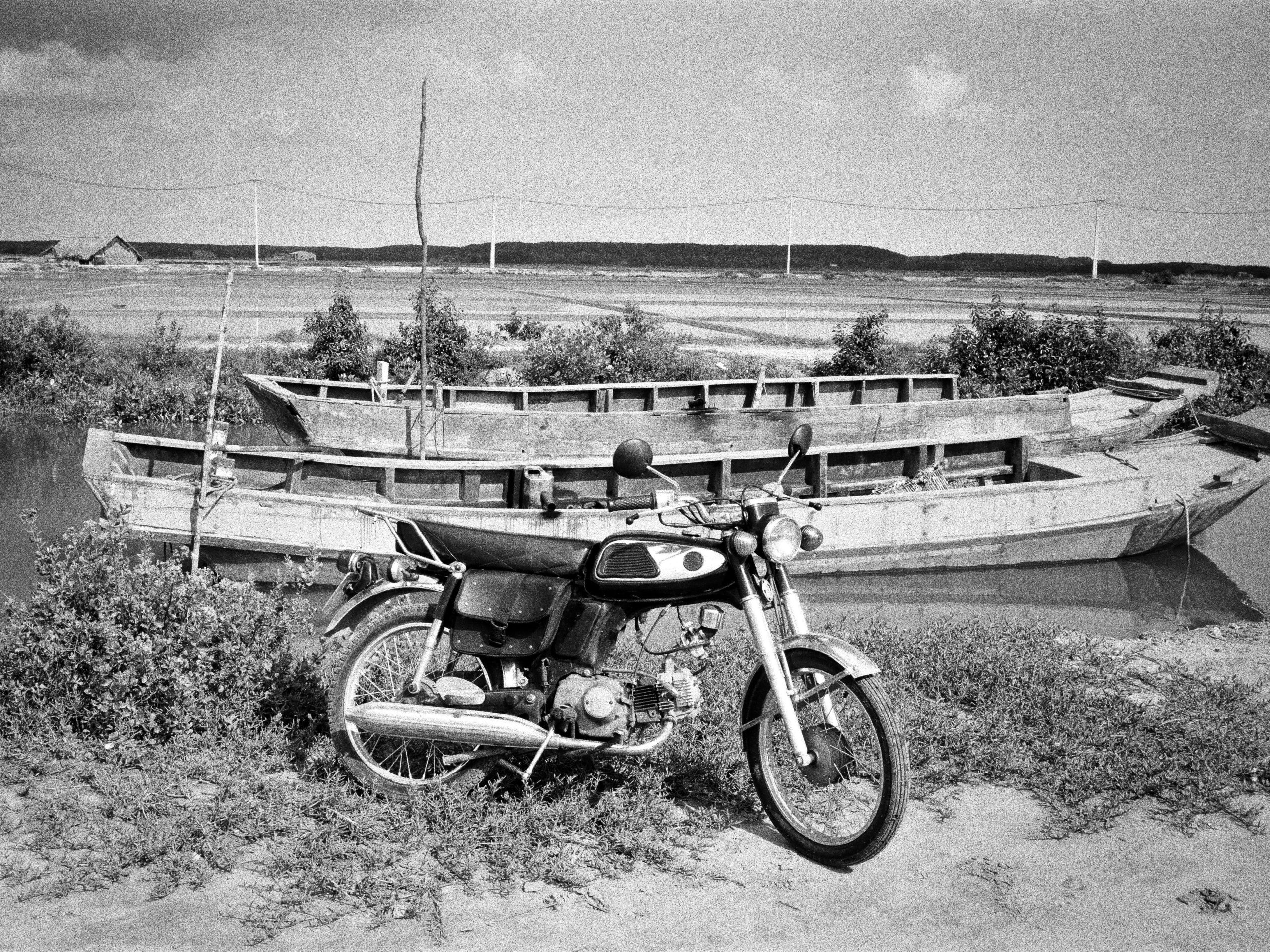 The best way to get acquainted with Cần Giờ’s terrain and topography is to ride a motorbike or bicycle the length of the Rừng Sác Road (the red line on my map). The ride is largely litter-free and balanced by an immaculate, well-landscaped median – a little human touch that contrasts nicely with the surrounding wilderness. I could scarcely believe my eyes when I first rode it: such a great riding road – and virtually empty to boot! – so close to Ho Chi Minh City. It’s an exhilarating, big-sky ride over mildly undulating countryside, through sparsely populated grasslands and over bridges crossing mangrove swamps fragmented by slowly pulsing channels of brackish water that rises, churns, and falls with the tide. Dart down one or two of the countless, inviting red-dirt roads that break off from the main Rừng Sác Road and disappear into the trees on the horizon. Stop at the top of one of the many bridges to chat with a local angler or take a photo of a lone fishing boat slanted on the muddy, low-tide shore; sip a coconut from the pier of one of the fishing villages at land’s end and get merrily lost as you try to find your way back to the main road.