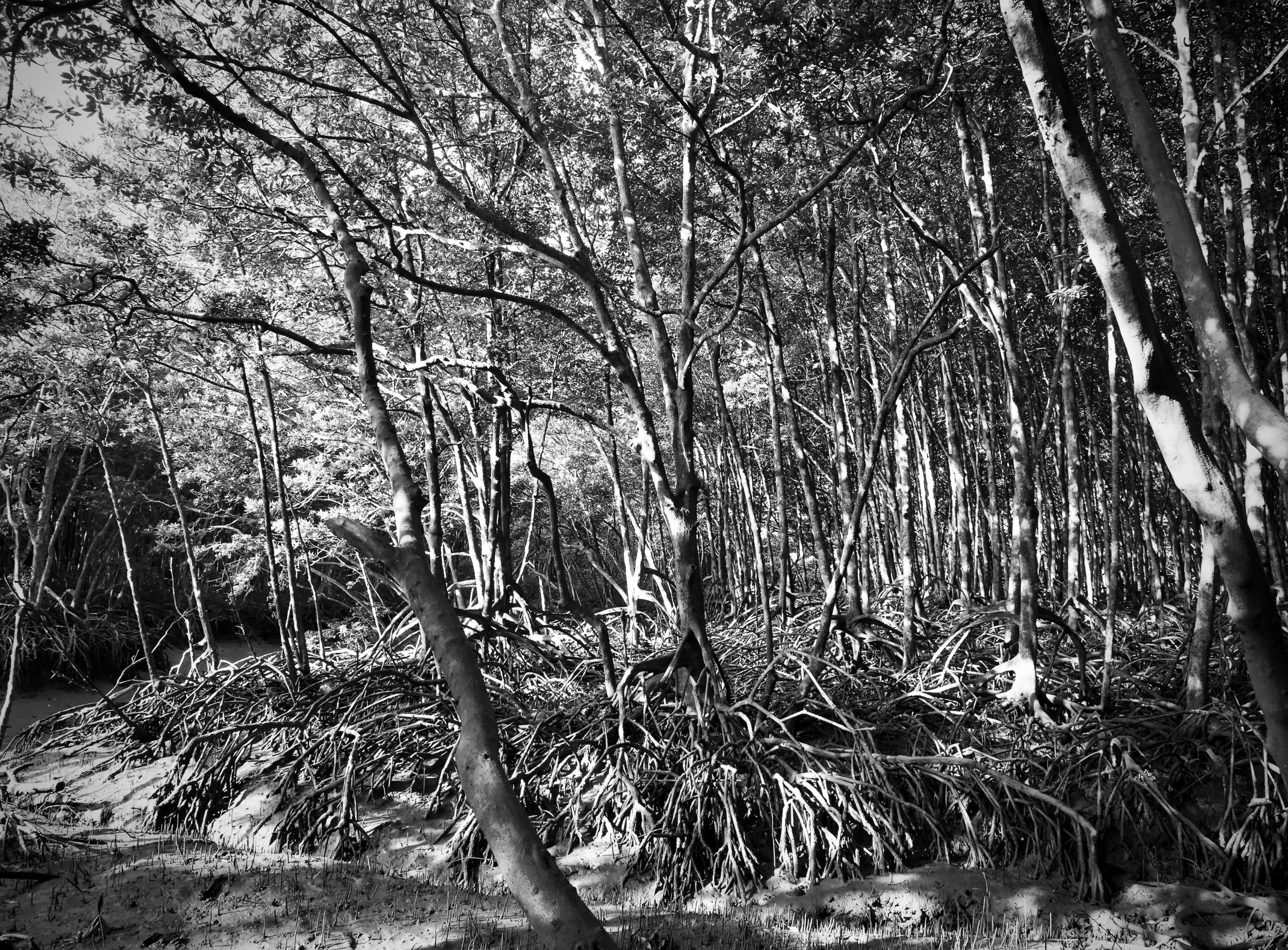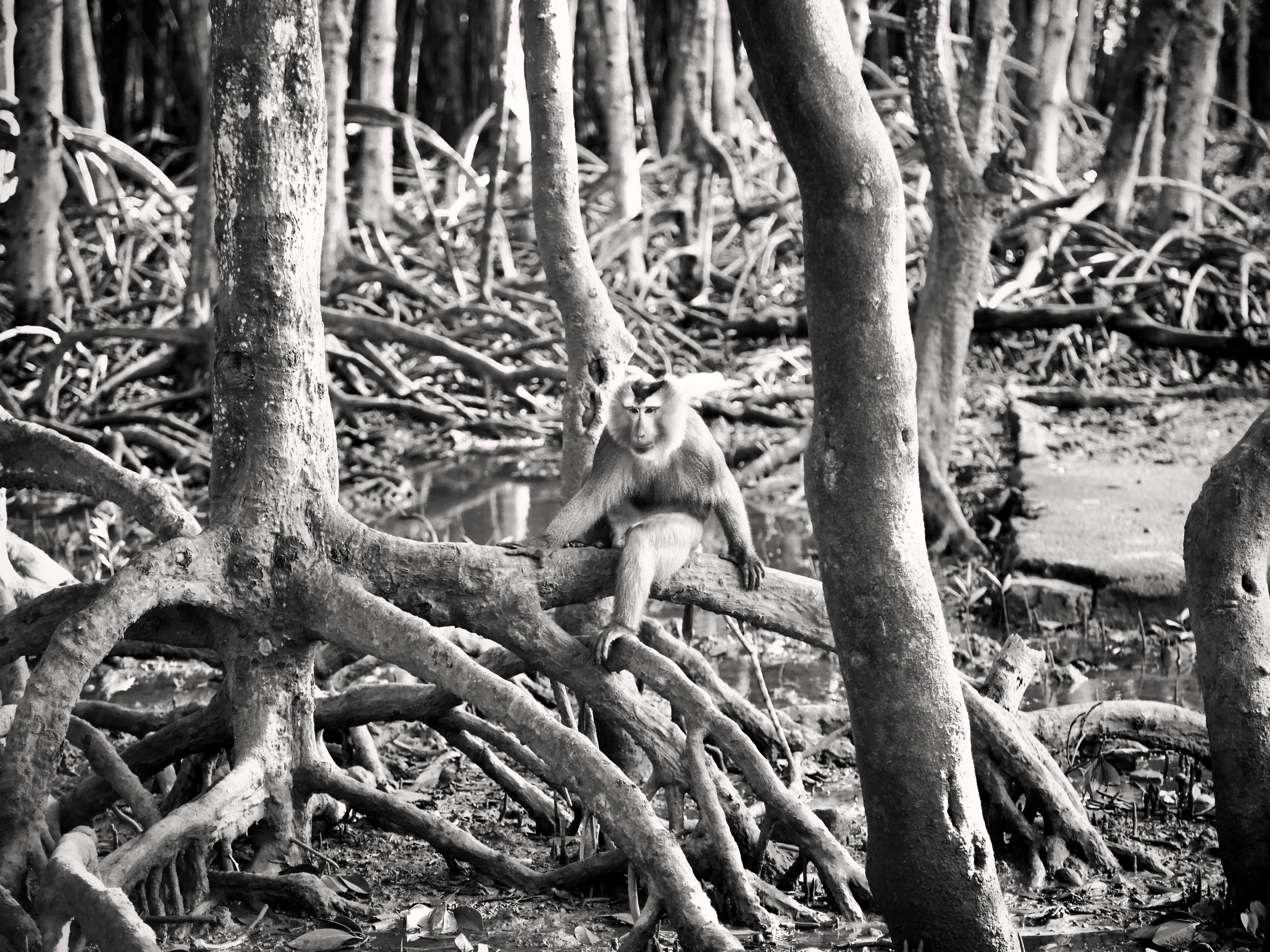 Walking through the mangrove trees to the base can be mystical. Many of the trees appear to be pulling up their own roots from the mud and you wonder if they might begin to walk when you’re not looking. The wooden walkway is unpredictable: watch your step. Some boards are new, some are rotted and they’re all held together with strips of plastic that have obviously been individually hand-tied. Rusty rebar is exposed in places where concrete handrails are crumbling in the moldering swamp. The forest is totally still and silent, except for the sounds of your footsteps and the “ploops”, “pleeps” and “plops” of pistol shrimp in the mud, snapping their claws at prey echoing among the trees.