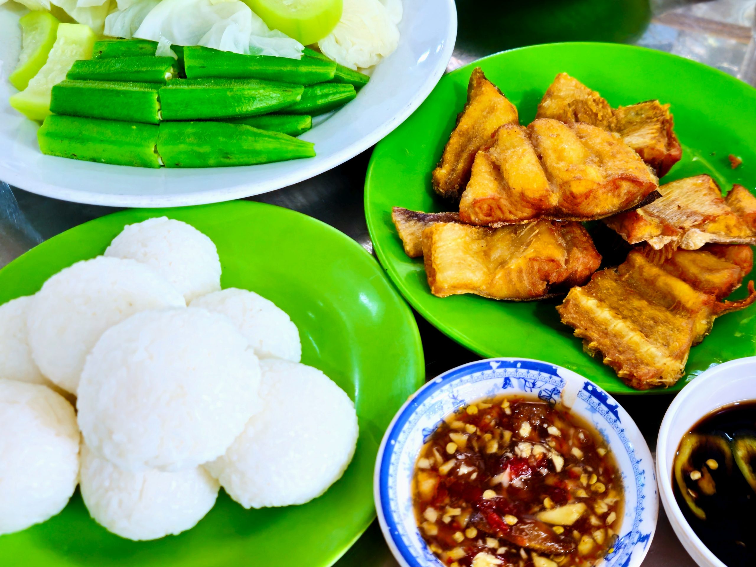 Khô Cá Dứa – Although the name translates as “pineapple fish”, this is misleading: fruit plays no part in this dish. Cá Dứa is a type of catfish (Pangasius kunyit) which is fried to light, fluffy perfection and accompanied with tamarind sauce and rice balls. Order a plate of boiled vegetables to complement. It’s a delight.