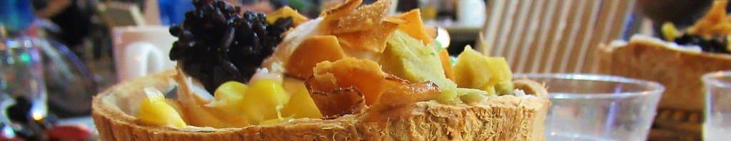 What you’ll have in front of you is: a coconut shell with its white flesh carved out into a curl (making it easier to eat) and filled with a scoop of white and creamy coconut ice cream. On top is a miniature artist’s palette of color and texture: purple sticky rice, crisp, toast-brown, roasted coconut shavings, bright yellow sweet corn kernels, luminous-green, gooey pandan-leaf flavoured pounded young rice, and little matchsticks of sweet potato. Served alongside the coconut is a glass of the naturally sweet and nutritious water from your fruit.
