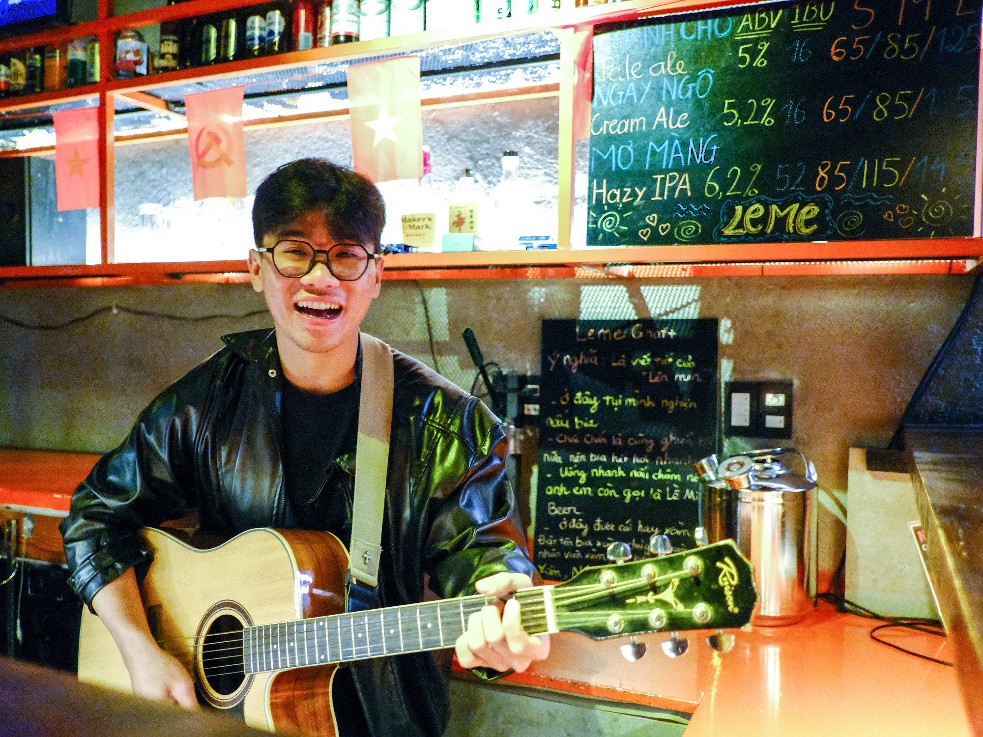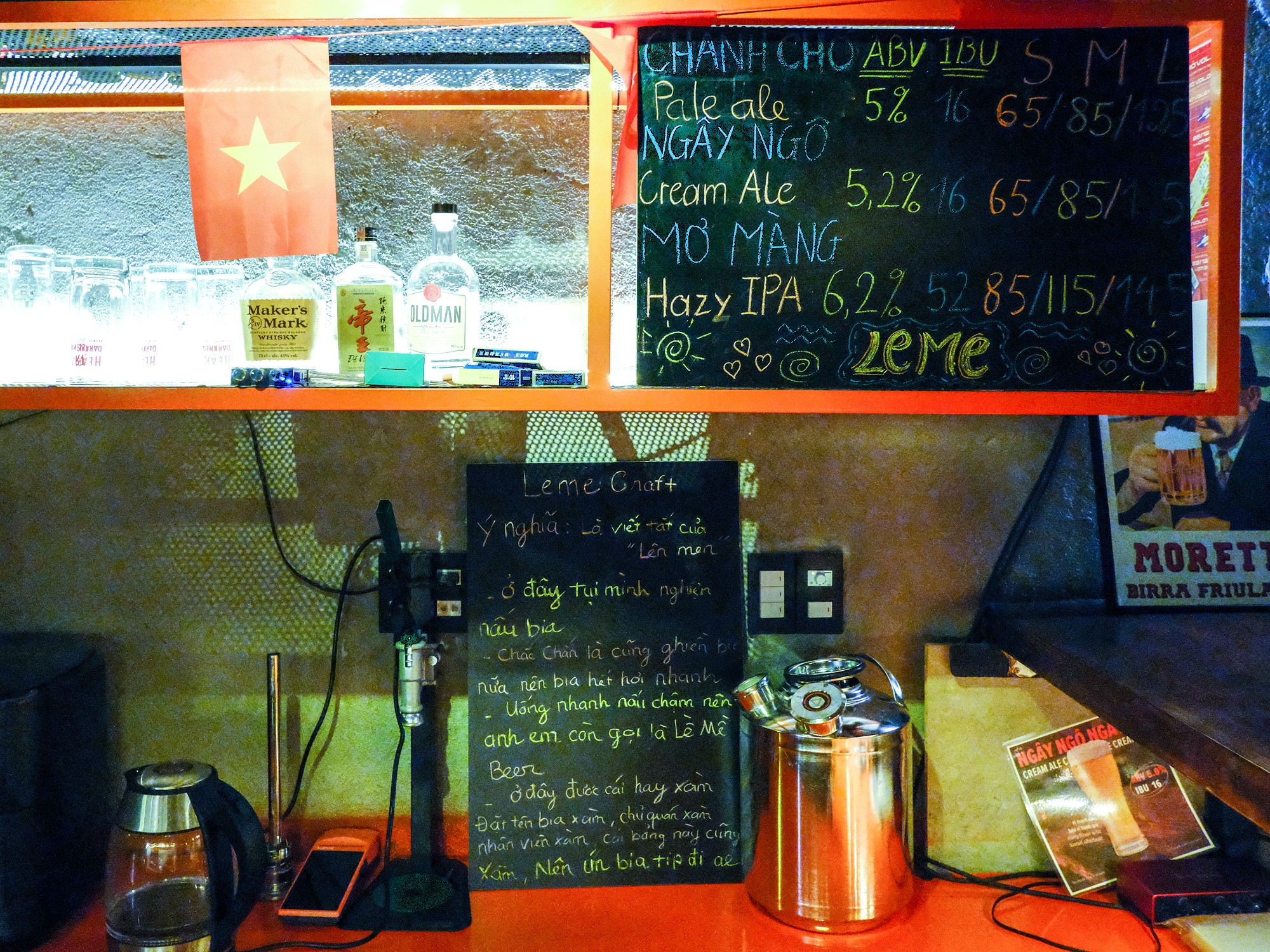 The bar offers three beers: pale ale, cream ale and hazy IPA. Each is available in three sizes and brewed locally by the owner. I was told the taps rotate occasionally, with a kumquat beer and a stout having appeared in the past. The kegerator was a point of ingenuity: an icebox converted into a beer pump for serving beer. Beyond the beer, there appeared to be little else on offer. An empty fridge sits to one side of the bar, while the counter is lined with empty cans and bottles. “Those are the boss’s collection,” I was told. Souvenirs from beers drunk elsewhere, perhaps. The owner, who oversees all brewing at Leme, also runs a homestay and a cocktail bar elsewhere in Đà Lạt.