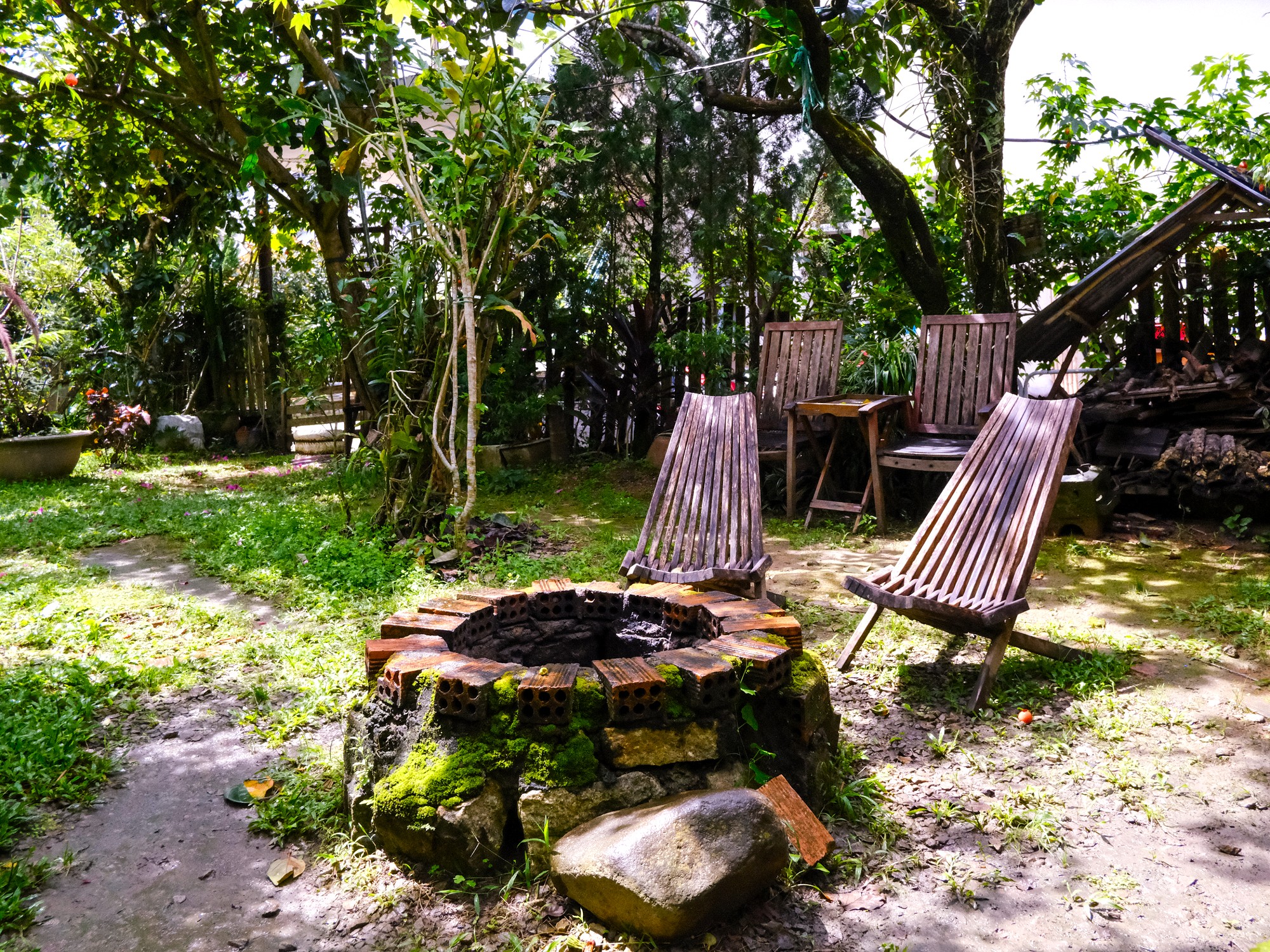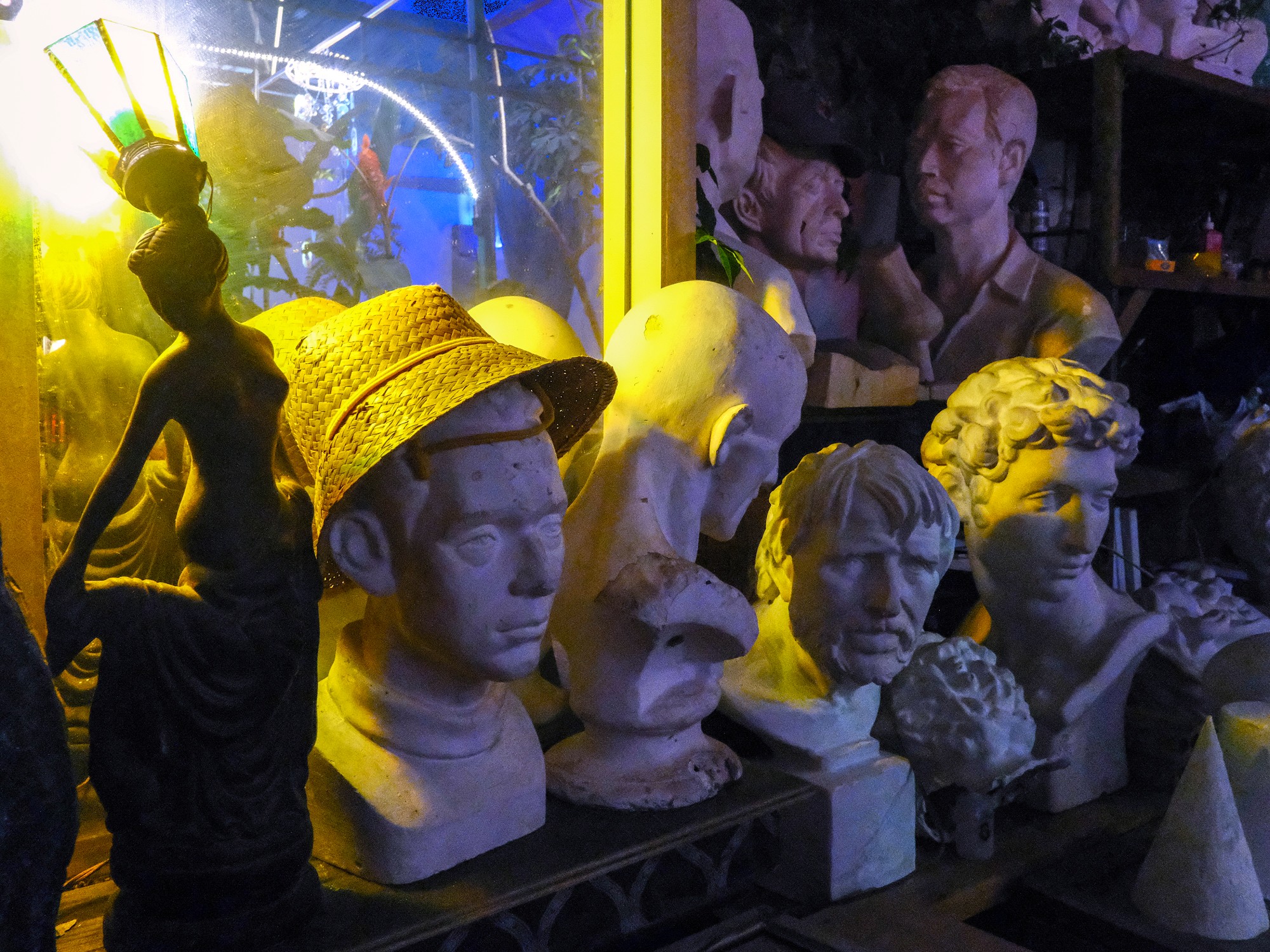 Located on a bend of Phạm Hồng Thái Street and housed beneath a semi-temporary greenhouse canopy, Cù Rú Bar is easy to miss. A fenced garden at the front, currently shared with a Japanese restaurant, leads along a narrow path through dense shrubbery. Descending a short set of steps towards the bar, you pass workstations scattered with tools, sculptures and paintings. The sense of disorder makes it clear these objects aren’t decorative props but evidence of a functioning studio. The main bar sits to the left, facing seating areas that blend into the surrounding garden. Behind it, large glass vats of house-made liquor (rượu nhà làm) line the shelves, while the two rooms flanking the bar are used for visiting artists, exhibitions and events.