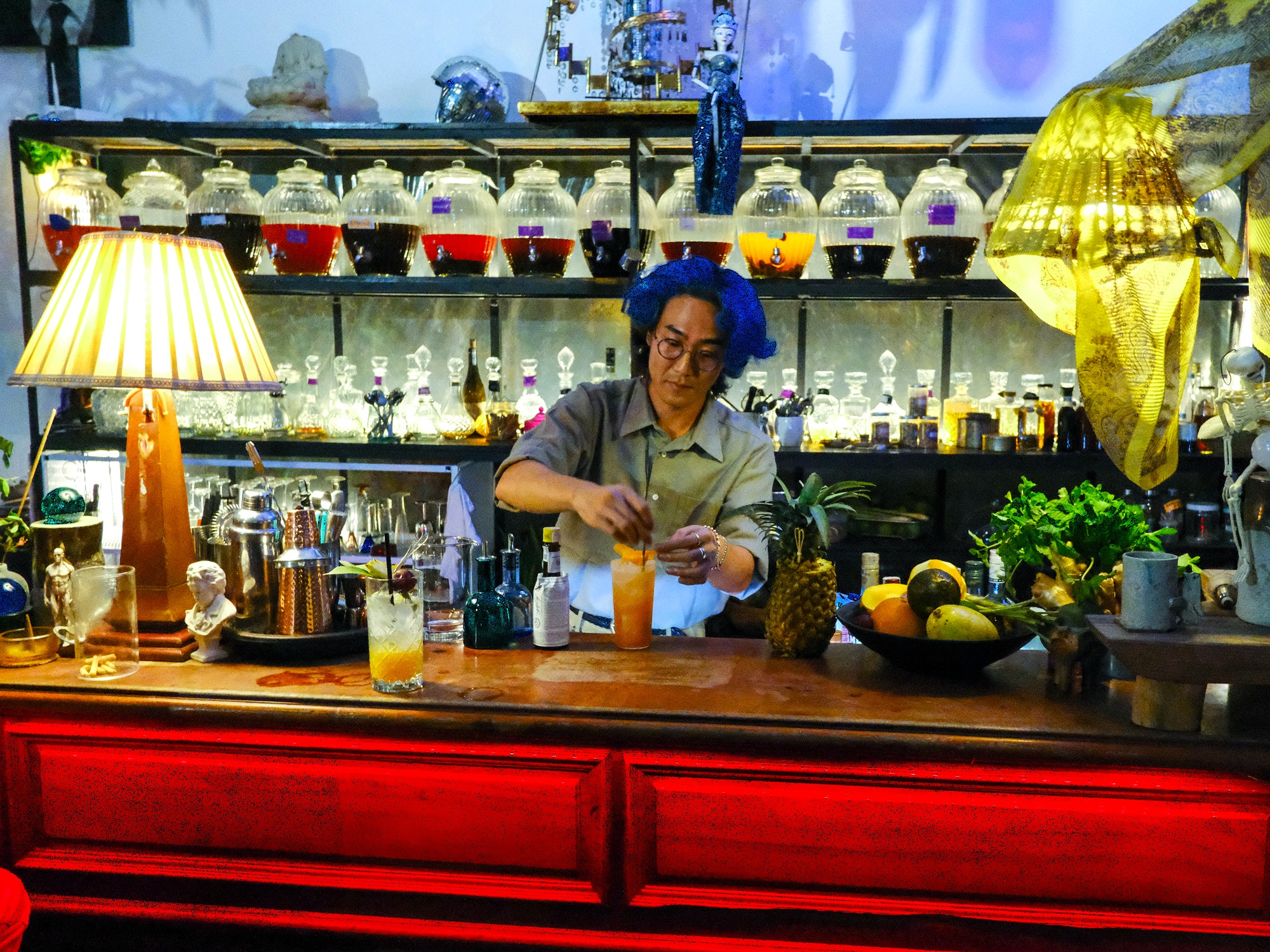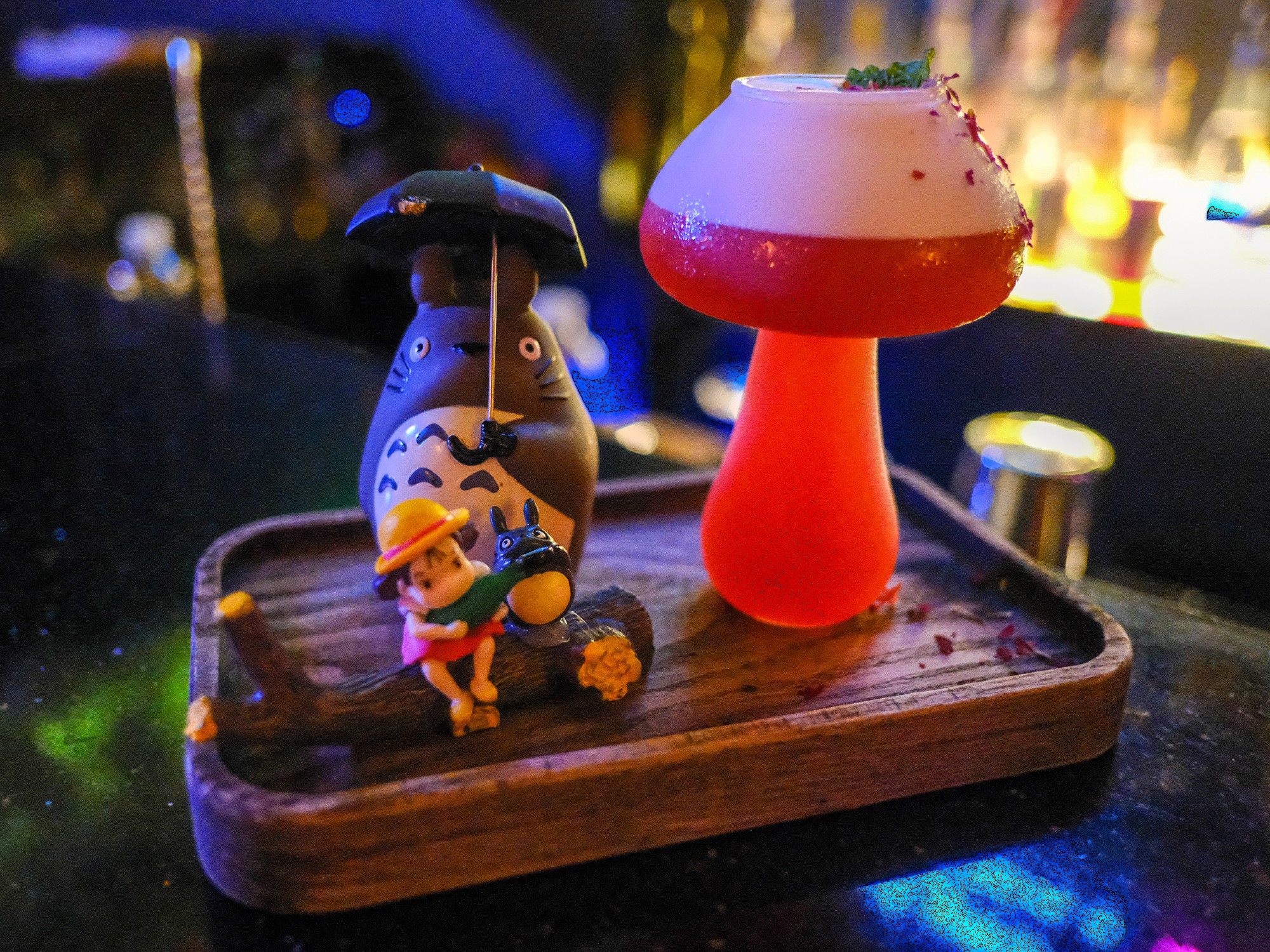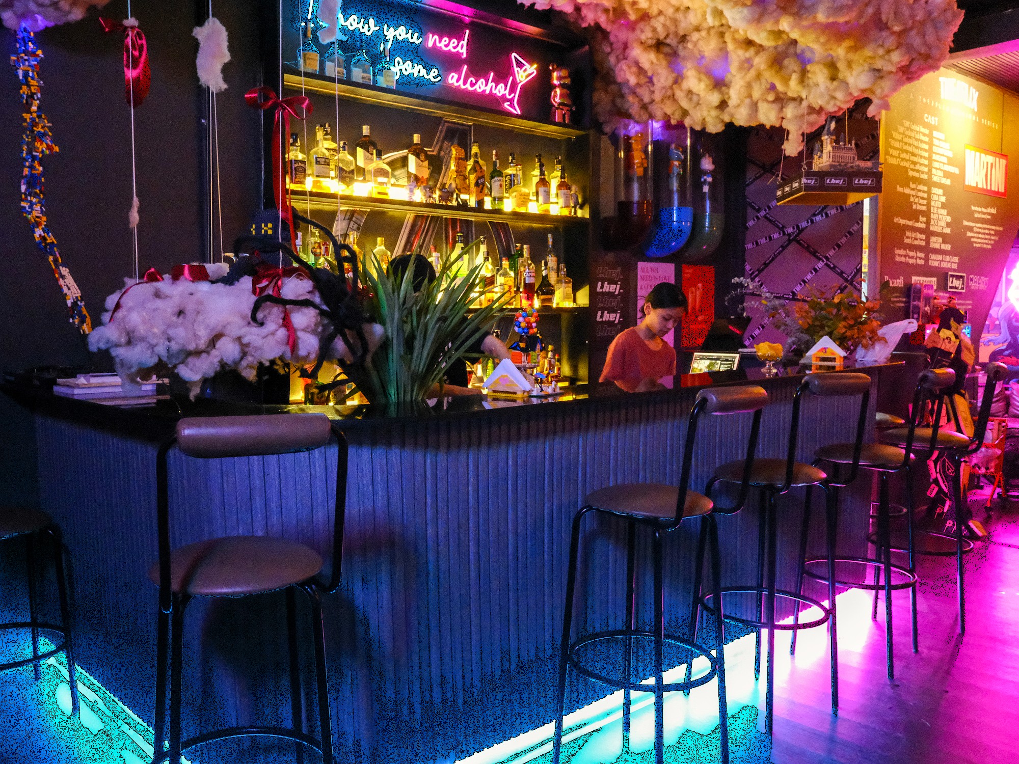THEJ reminded me of time spent with my childhood best friend during our early teenage years, when we dreamed of entire days playing video games, obsessing over collectables and imagining a bedroom doused in neon lighting as the ultimate personal space. This bar is essentially that fantasy realised. It’s a compact, one-room cocktail bar built around nostalgia and escapism, complete with homemade arcade-style consoles loaded with thousands of games and a cocktail menu themed around comic characters and popular children’s literature (well, just Harry Potter and Doraemon). Drinks have names like the Saiyan, Harry Potter and Pikachu, each arriving with a collection of themed garnishes and decorations to extend the theme of your drink.