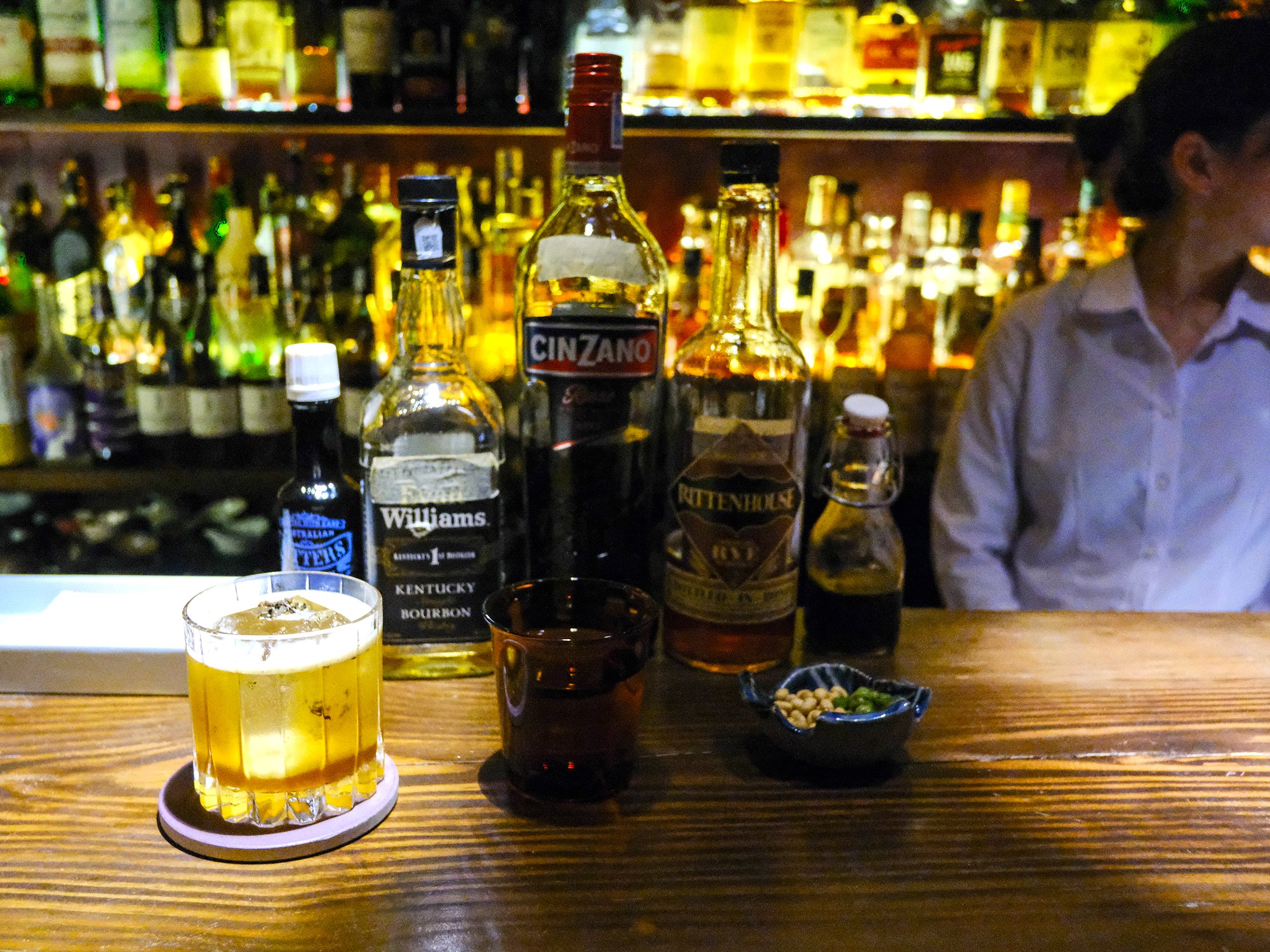 My cocktail arrived around ten minutes later. I had hoped to watch it being made, but preparation took place at the opposing end of the bar. When it was served, the mixologist briefly explained the components before returning to other guests. The drink included Cinzano Rosé, Rittenhouse rye, Williams Kentucky bourbon and mắc khén, a forest pepper harvested in Vietnam’s mountainous northwest. Spirit-forward, floral and dry, the drink finished with a pronounced peppery kick. The cocktail was a pleasant alternative for sweet-toothed drinkers like myself who tend to slurp sugary cocktails all too quickly.