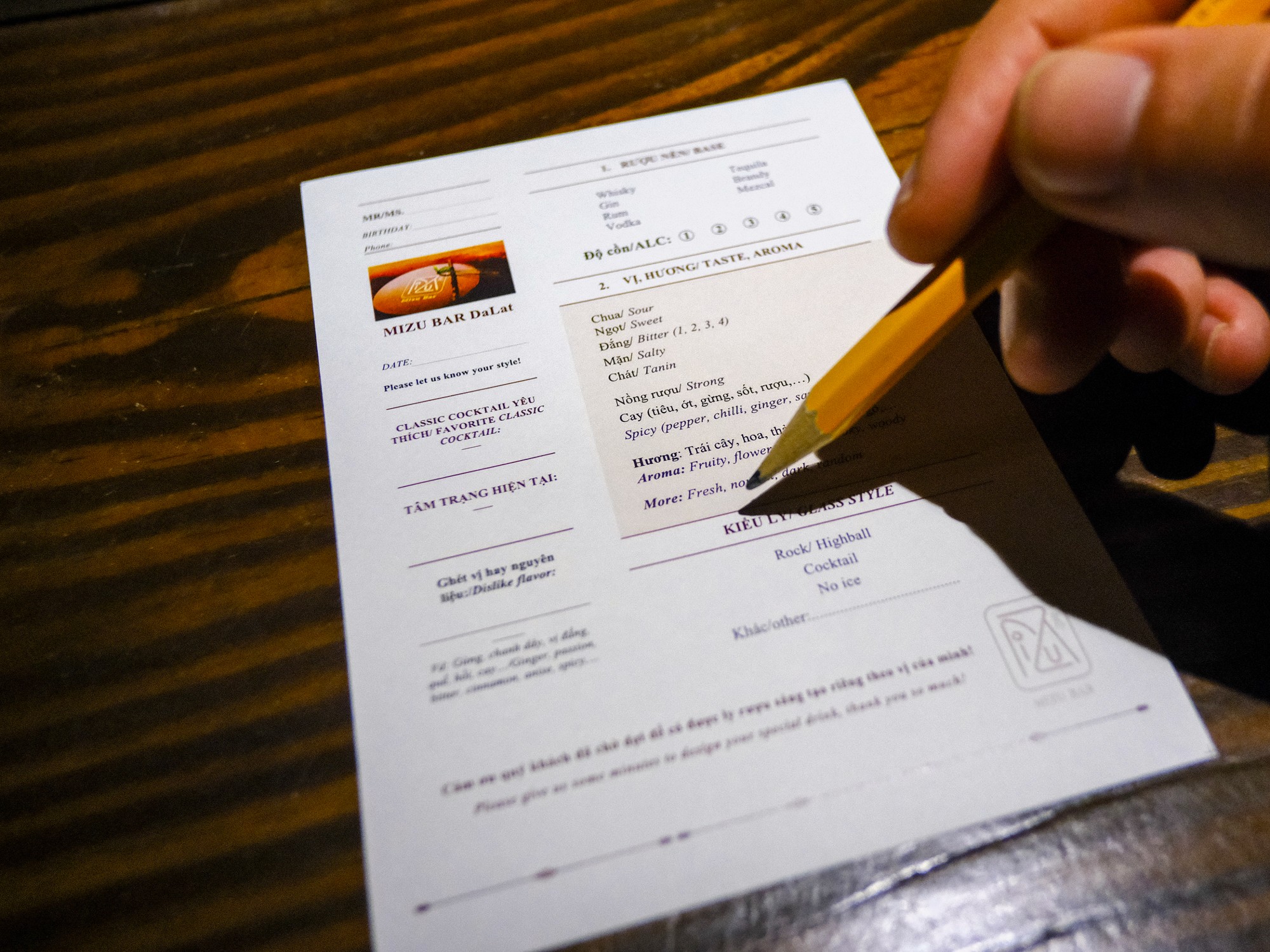 I visited on a busy evening. A group of four and two separate couples occupied most of the bar, while behind it, two mixologists and two barbacks worked steadily through orders. After edging past other guests and finding my seat, I was offered a choice between classic and bespoke cocktails. I was forewarned that bespoke drinks typically cost between 250,000-350,000vnđ. Guests are given order forms to indicate flavour preferences, which the bartender then interprets to create a bespoke cocktail. As with other venues of this type, I opted to give the mixologist free rein rather than request a specific drink.