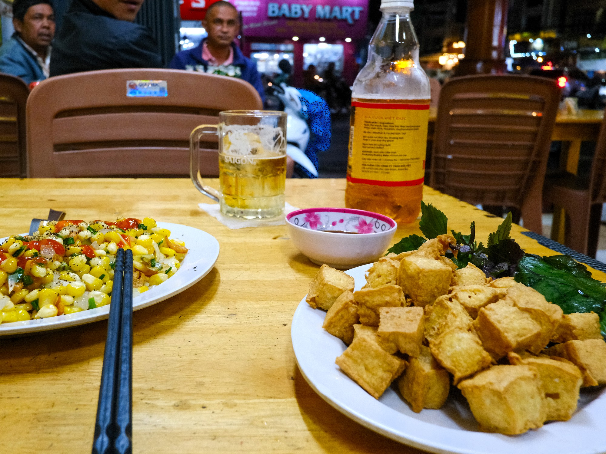Having already eaten a heavy bò tơ lunch earlier in the day, I ordered the fried tofu and sweetcorn to accompany my drink. The dish was oily and forgettable, consolidating the sense that food here is merely an accompaniment to beer rather than a main draw. Ultimately, I came for the beer and atmosphere, not the food. On this particular evening, Cô Tâm was the saving grace of what otherwise felt like a subdued night. Most patrons were either glued to their phones or drinking out of habit rather than for enjoyment. Still, it’s easy to imagine Thanh Trà coming alive on other nights. Whether it’s an engaging place to drink depends heavily on timing as well as who happens to be there when you visit. Bia Lạnh Thanh Trà isn’t the only option for cold beer at economical prices in the area. Nearby Bia Hà Nội and Bia Đức offer similar experiences and are worth checking out as alternatives.