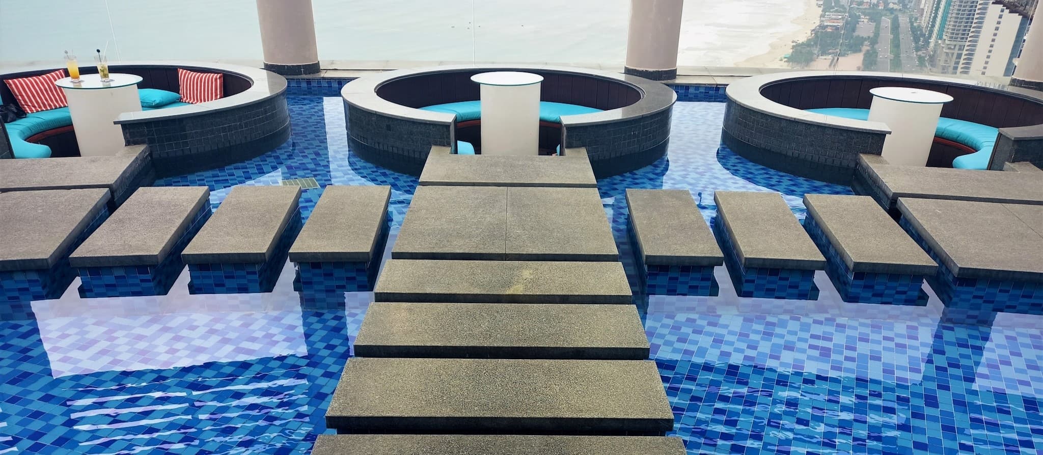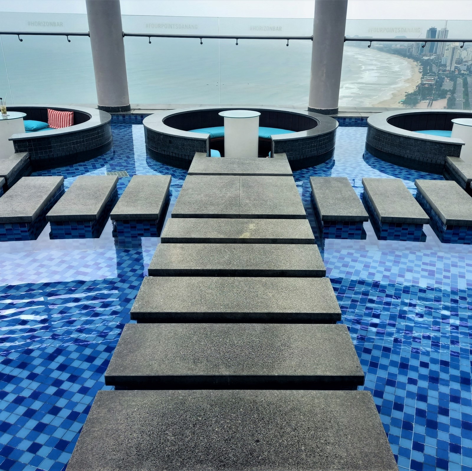 Breakfast, Dining & Drinking: The hotel’s main dining restaurant is downstairs at The Eatery. This is where the daily buffet breakfast is served. A wide spread of Asian and Western dishes and decent quality (even the coffee is pretty fresh) makes this buffet a good one. The food is nicely presented and staff are friendly, but the dining hall is a bit bland. Up on the 36th floor is the Horizon Rooftop Bar. Focusing on locally brewed craft beers as well as cocktails, wine and bar food, this is the Four Point’s big Instagram-ready main event. There’s inside seating by windows, but it’s outside that the photo opportunities await: round tables and chairs are sunken into the serene waters of the infinity pool behind which panoramic views of Đà Nẵng city, beach and ocean sprawl into the distance. It is impressive, and the drinks are fine, too. Prices are lower than you might expect for such a bar. (I’ve written a full review of Horizon Bar on this page.)