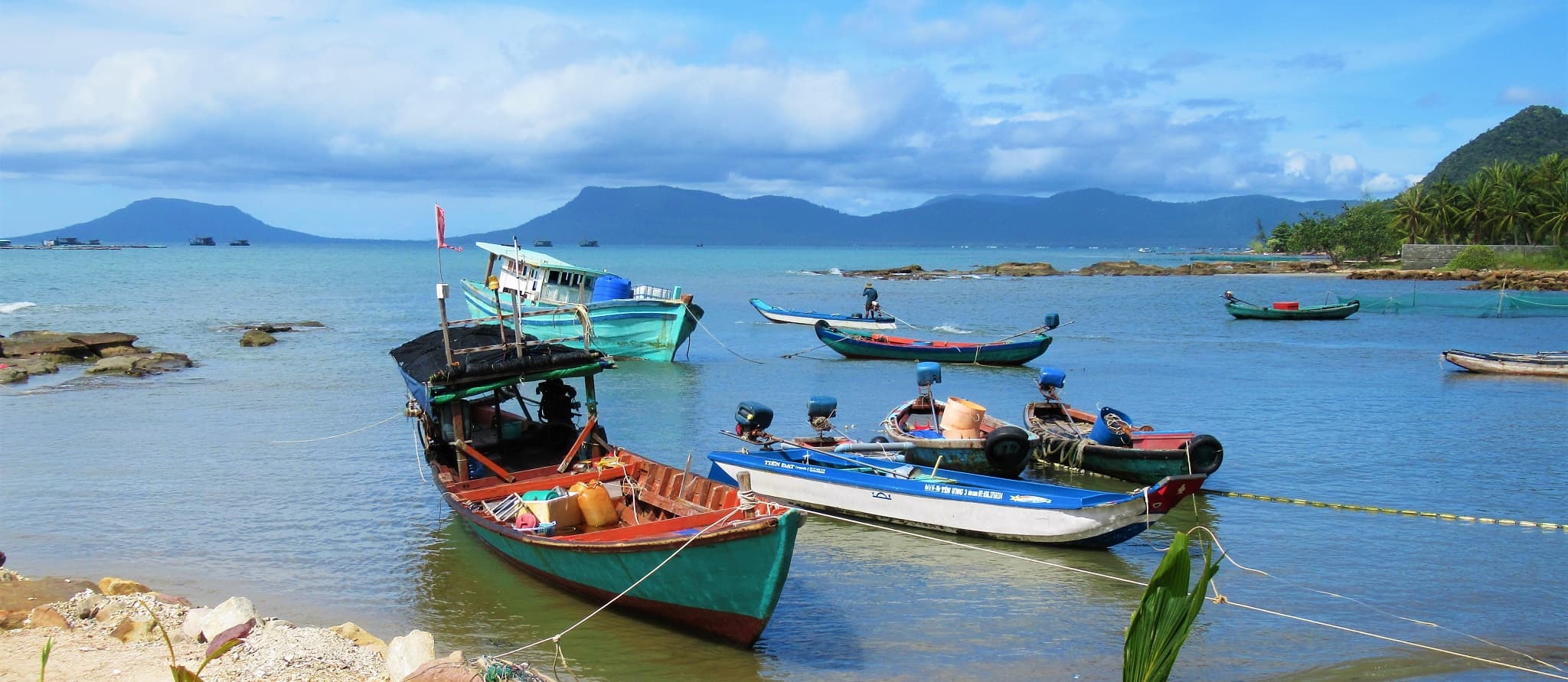 The Location: As far northwest as roads go on Phu Quoc Island is the fishing village of Ganh Dau. From here a lane leads east through the local market, narrowing as it leaves the settlement behind and edges along a quiet coastline studded with coconut palms. Before turning into a dirt track and dead-ending, the entrance to Gold Coast is marked by a large water tower. Although there are now several small resorts peppering this bay, Gold Coast is by far the best, not least because of its location of a beautiful little inlet with a crescent of white sand beach. Gold Coast is all about the position. From the resort’s pier, the views stretch to the hills and unbroken jungle of Phu Quoc’s northern bays – yet to see any development whatsoever – and the Cambodian islands and mainland (including the surprisingly high ridgeline of Preah Monivong Bokor National Park, behind Kampot). It’s a memorable setting and almost unique for any beach on Phu Quoc Island.