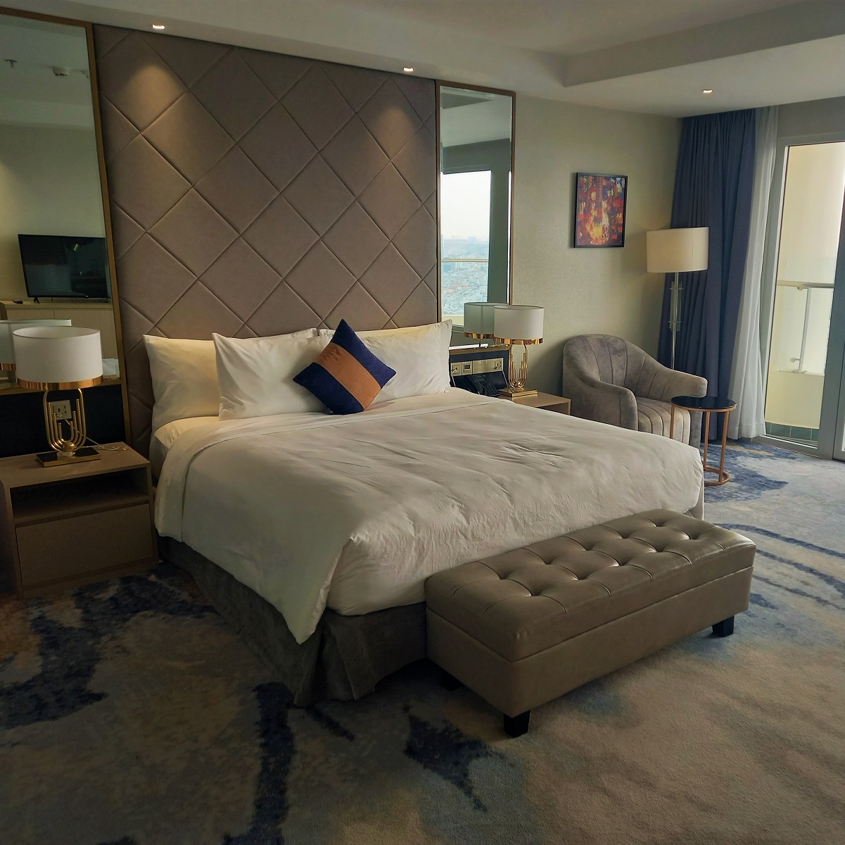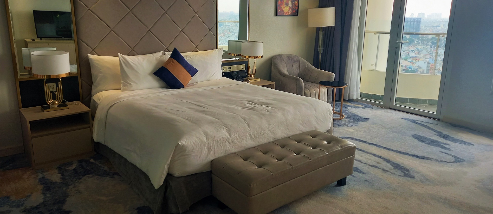 Guest Rooms & Décor: With some 280 guest rooms, La Vela is a large city hotel. Rooms are contemporary, classy and well-equipped, but a little bit on the generic ‘business club-class’ side. Deluxe is the cheapest tier, but these are quite small at 28m2. Luxury Deluxe rooms are only $10-$20 more expensive but they are much bigger and have higher, better views and balconies. All rooms feature floor-to-ceiling windows with great city views, freestanding bathtubs, big TV, carpets, soft chairs, work desk and everything else you’d expect to find in a 5-star hotel such as this. The bathroom partition is made of transparent glass, so there are electric blinds for privacy. In general, the colour scheme is muted and calming, but there’s just a hint of bling in the gold-rimmed fittings and fixtures. All in all, the rooms are comfortable hideaways from the heat, rain, humidity, noise and pollution of Saigon, but with excellent views of all the latter from the comfort of your balcony or chair.