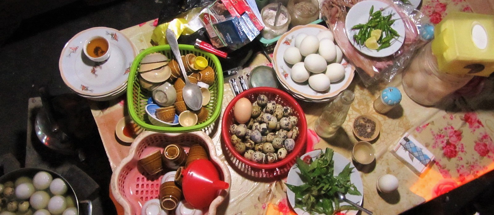 In Dalat, after a long day, I’d intended to go to bed early. But then I stumbled upon the street food stalls on Nhà Chung Street, near the French colonial church. I spent a good couple of hours eating bánh căn followed by fetal duck egg, surrounded by chattering students and locals, all dressed in coats and hats to keep warm in the mountain air. A couple of very friendly ladies served the bánh căn; little spongy pancake things cooked in tiny pots over a flame and served with a dipping sauce with sour mango, fried shallots and spring onions. The pancakes, made of rice flour and quail eggs, soak up the sauce perfectly. Bánh căn are very popular in Dalat, but more commonly found in coastal regions between Vung Tau and Phan Rang. For dessert I had several boiling-hot fetal duck eggs (which are always much tastier in highland and rural areas, away from the big cities) to fortify me against the cold night.