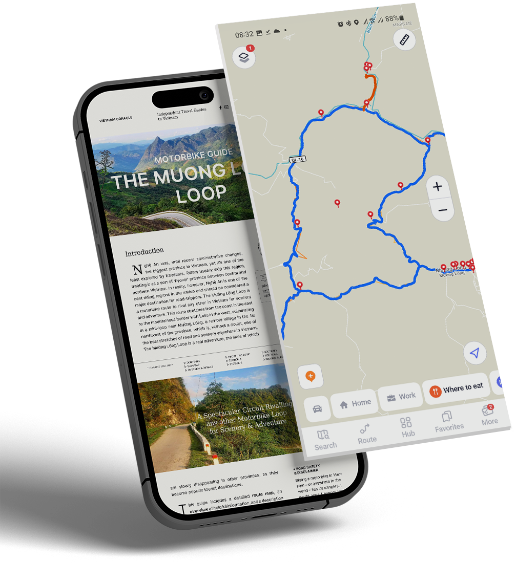 Offline Guides & Maps are specially packaged versions of some of the most popular Vietnam Coracle guides, designed to be used anywhere, anytime, regardless of whether you have an internet connection or not. My offline packages include beautiful, custom-designed PDF versions of a selection of Vietnam Coracle guides (either use them on your device or print them out), as well as KMZ & GPX map files and step-by-step instructions to use my maps on your phone without WiFi or data. This means no matter how far off the beaten path you go, you will always be able to access the information in my guides and follow the routes on my maps. Besides their practical utility, Offline Guides & Maps are a great way to support my work: all online content on Vietnam Coracle is free; these offline packages offer added value and convenience for travellers at a small cost.