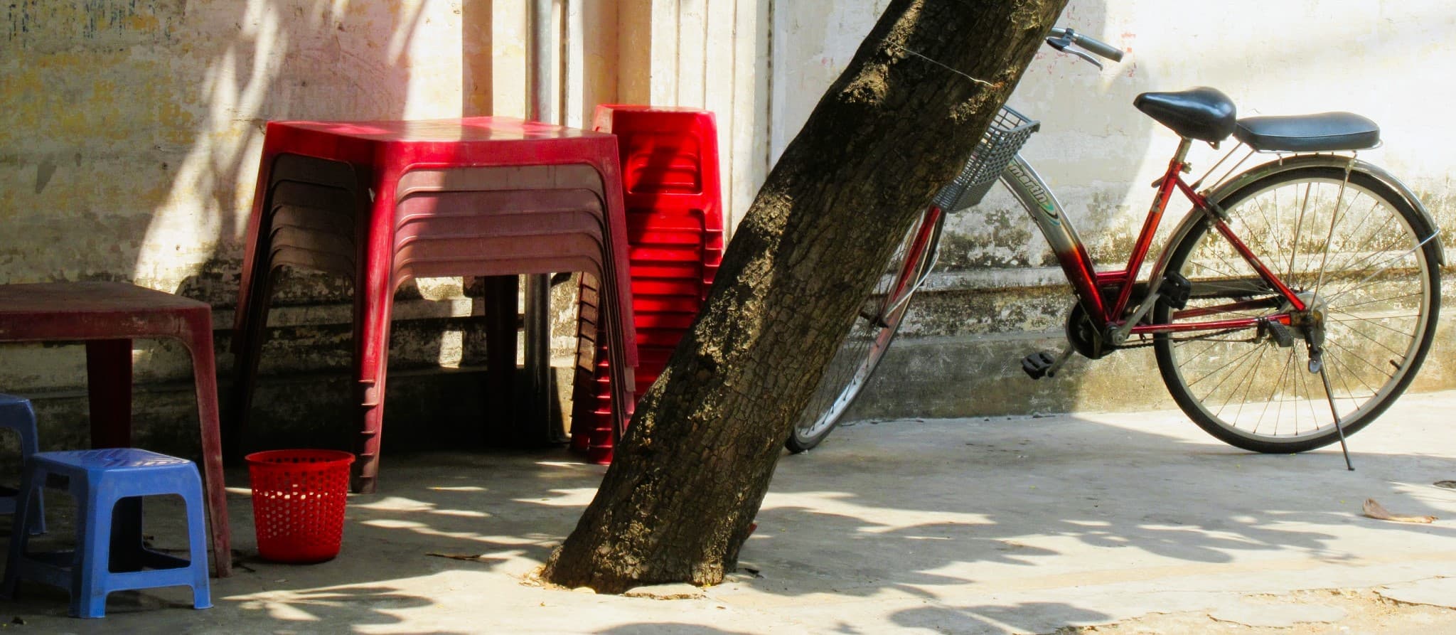 A pneumatic drill starts whining. Down the alley, a construction team sets to work. The peace is broken; I shall wander off now. As I move to leave, old auntie cô wheels her mountain bike out of her home. Off she pedals. Where are you going, auntie? To the market, she replies.