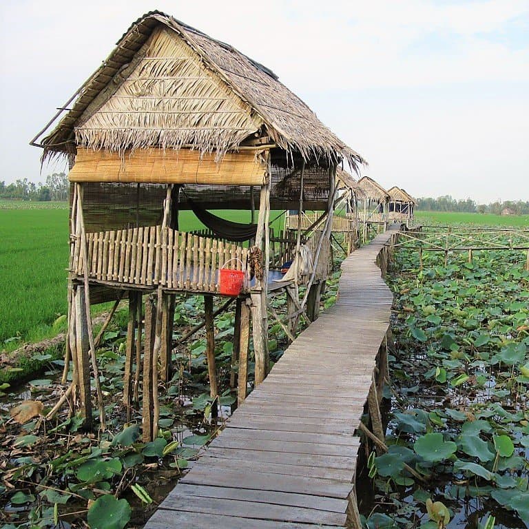 In the Mekong Delta province of Dong Thap, a collection of bamboo & palm-thatch huts on wooden stilts above a sea of lotus flowers, offer a night in a hammock or on a futon under a mosquito net, just a few feet above the frogs, the fish & the flowers…