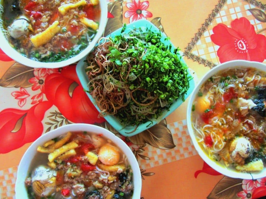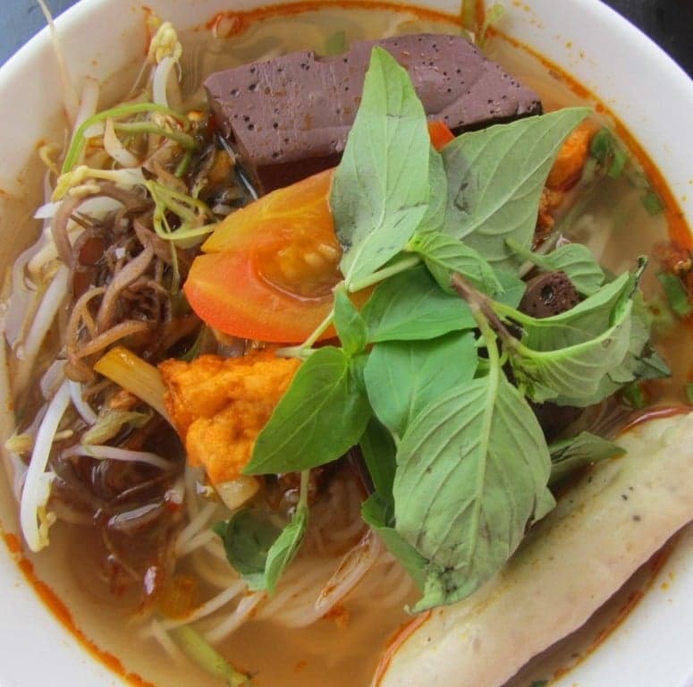 A broth of tomatoes & pulverized crab poured over white rice noodles & topped with marinated snails, bún riêu cua ốc is one of Vietnam’s most complex soups