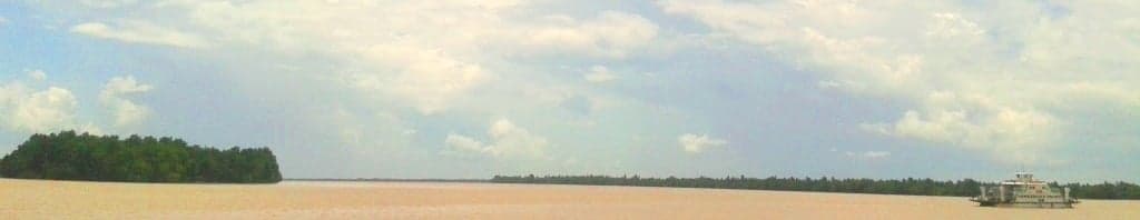 Better seen by boat: a Mekong barge ploughs the muddy waters