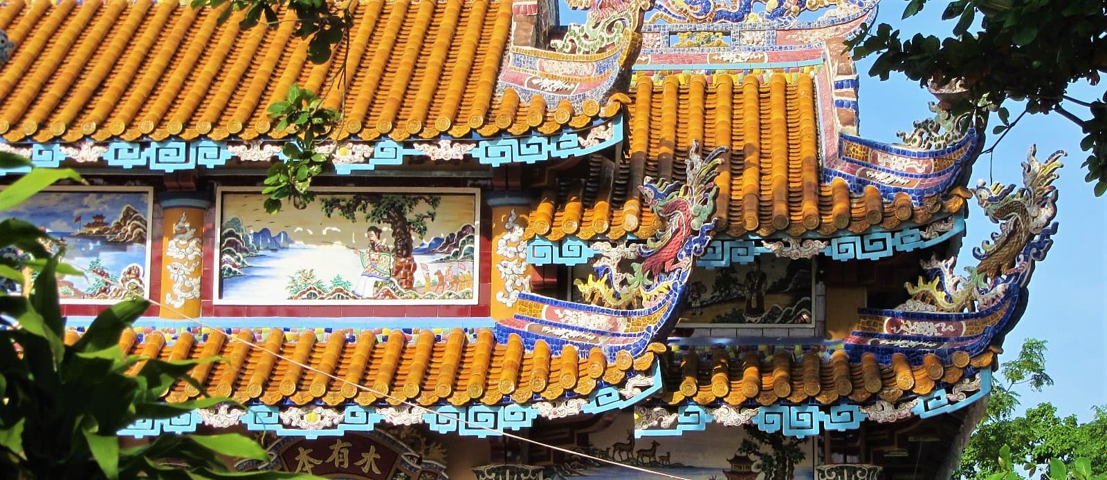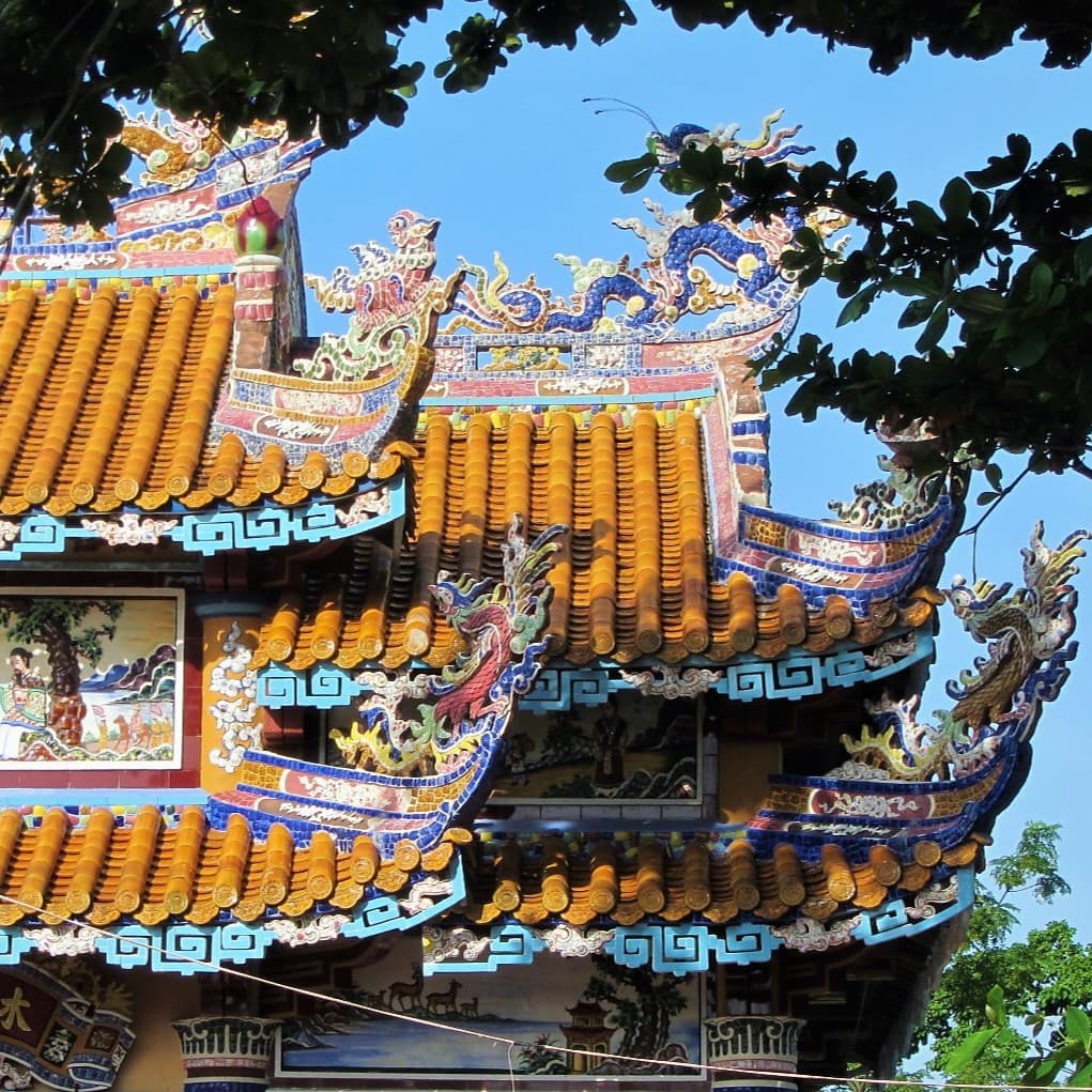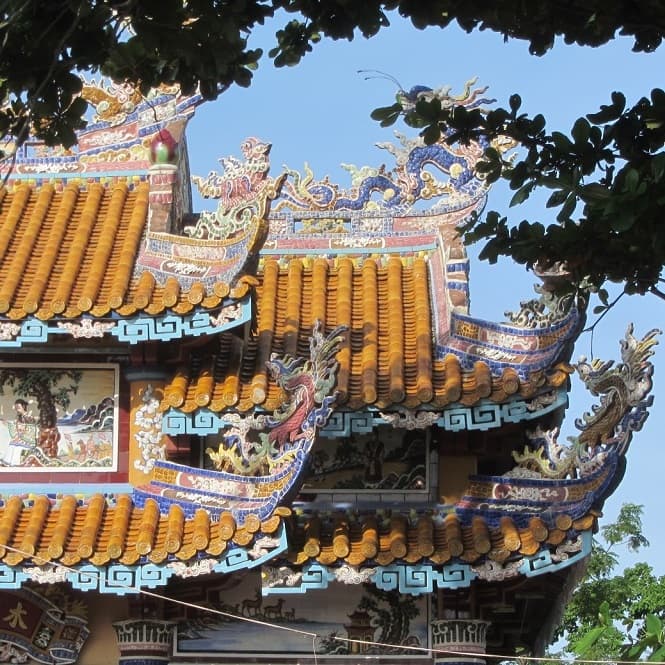 On the inland side of the road, the tombs are ever-present and ever more elaborate. Dotting the sand dunes behind the trees, or rising in formation on hillocks like terraced rice fields, the dead far outnumber the living in this dry, salty, sun-drenched region. But these are not ancient tombs; they’re recent. Indeed, dozens are still under construction. Vietnamese buy plots of land for their entire family and commission large mausoleums with intricate carvings and decorative motifs depicting symbolic stories. One of the most important considerations when choosing a site for a tomb is (as it was for the emperors who commissioned the famous royal tombs outside Huế) the principles of feng shui (or phong thủy in Vietnamese). Meaning literally ‘wind and water’, this is an ancient Chinese system which takes into account the lay of the land and other natural phenomena to assess the best location for a structure, among many other things.
