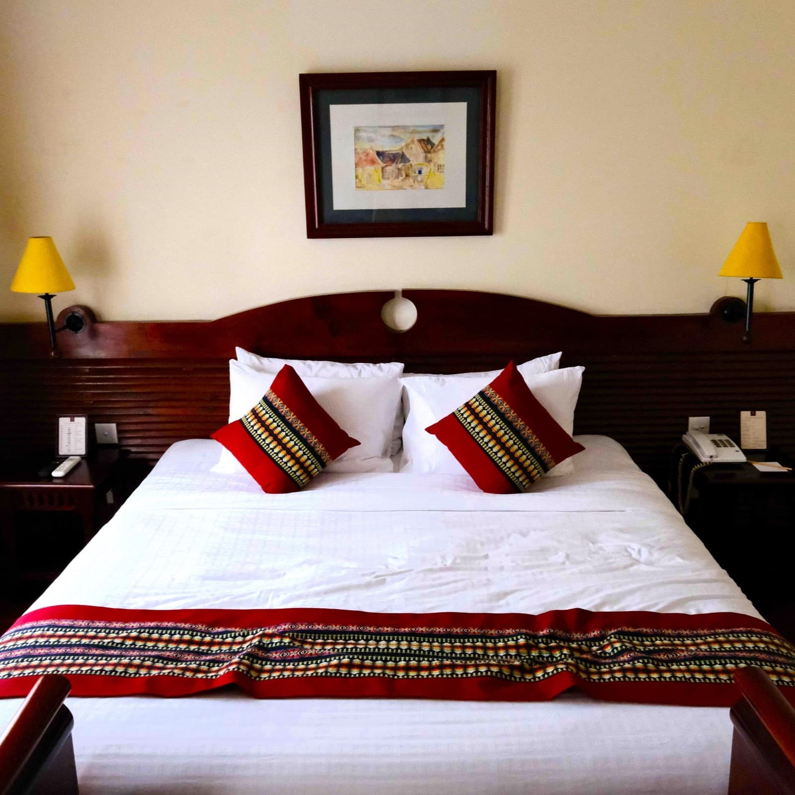 Rooms are comfortable and spacious, appointed with sturdy wooden furniture. Walls are painted in earthy yellows and browns, in tune with the hotel’s French-colonial theme. The tiled floors are cool and spotless. The beds are very inviting with lots of pillows and blankets, although I could feel the springs sometimes during the night. Glass bottles of drinking water are provided in the rooms and can be refilled at communal dispensers free of charge. Despite the hotel’s age, there was no sign of deterioration in my room. The materials used to create the shower tiling and bathroom sink are of good quality and are either highly durable or have been recently refurbished. The shower takes a little time to warm up and respond to changes in temperature but the water pressure is strong.