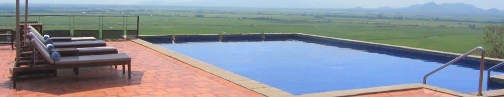 The swimming pool is in a marvellous position overlooking the landscape across to Cambodia