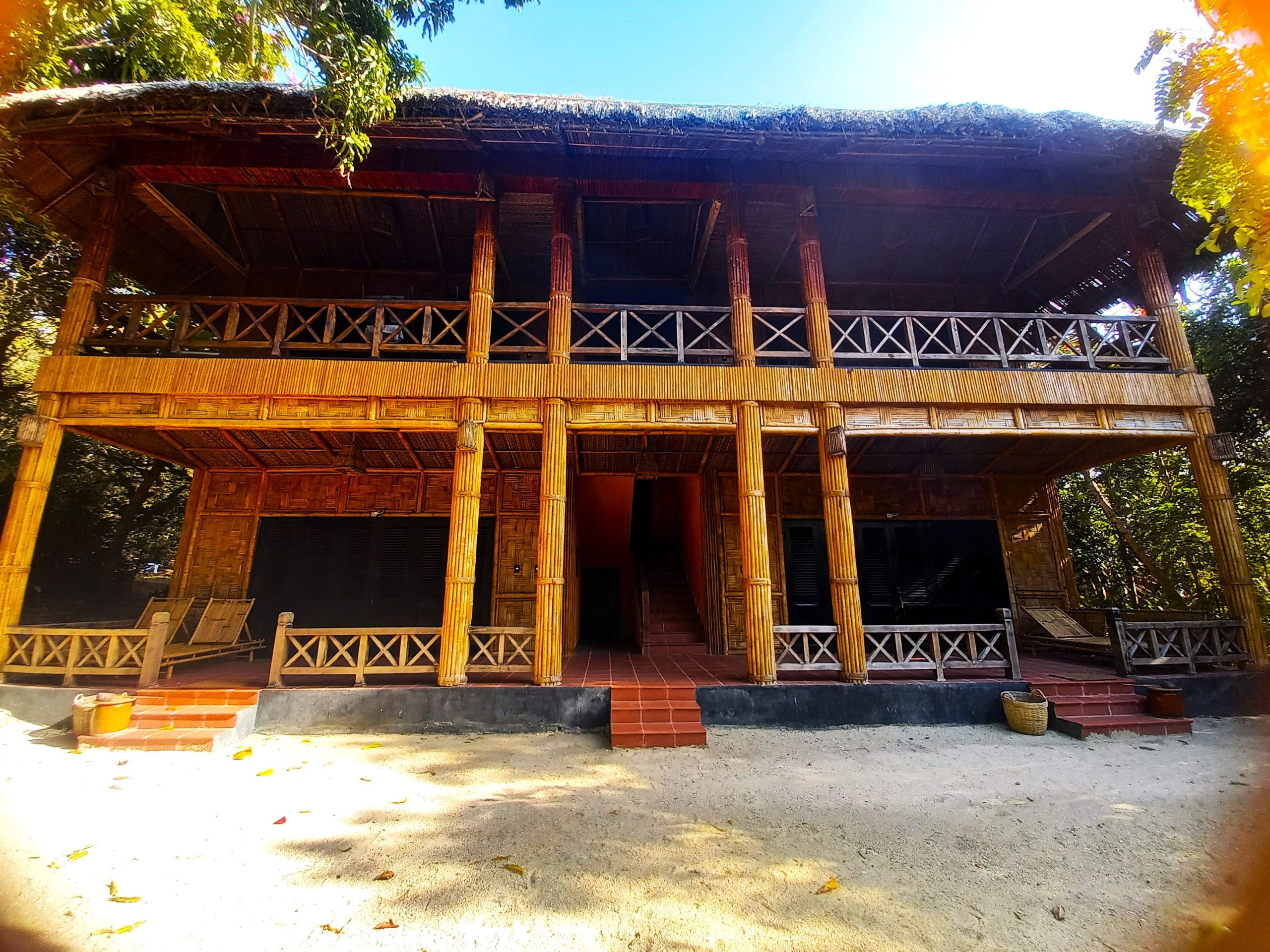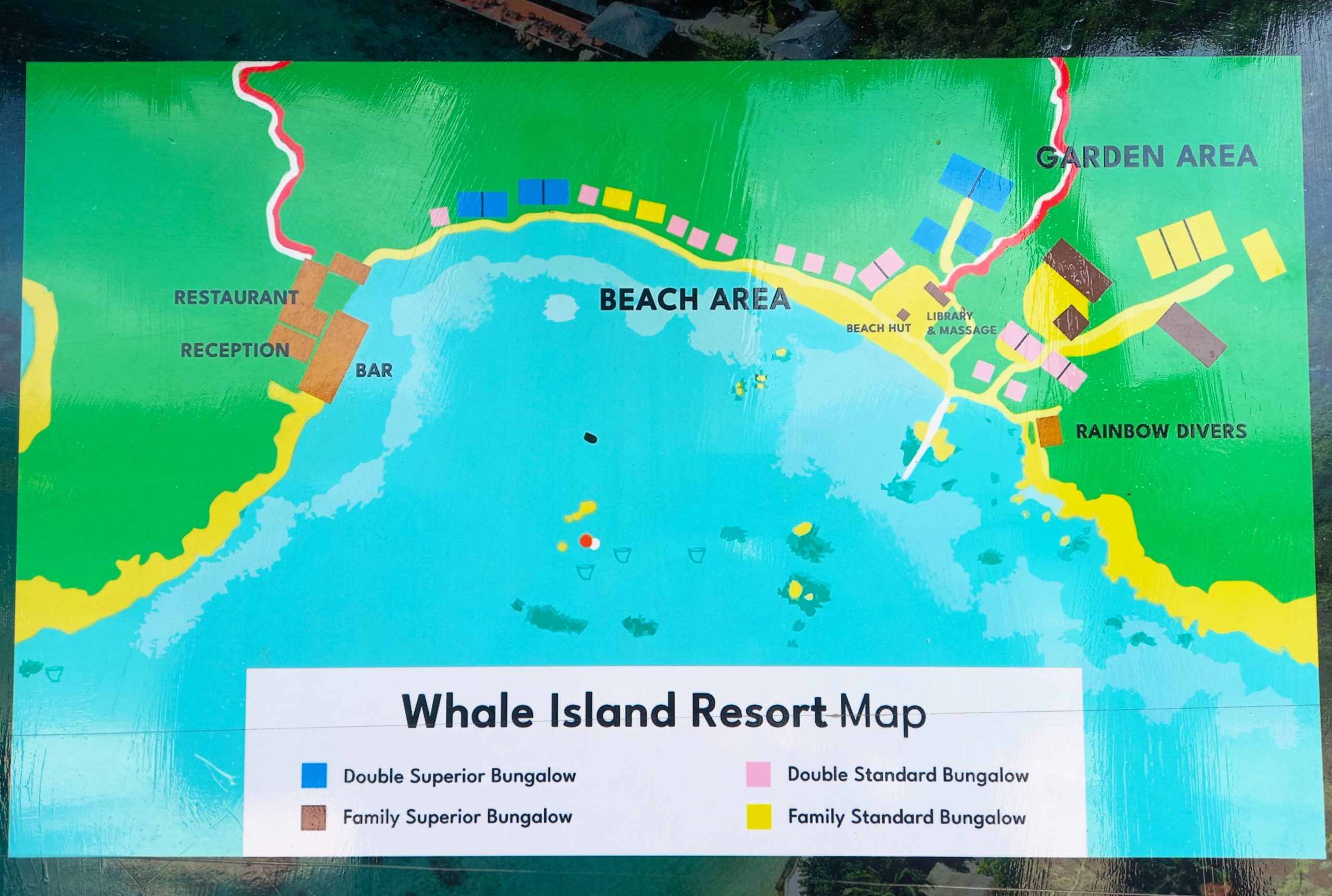 The resort only occupies a small portion of Whale Island: a sandy bay on the northwest shore. At the southern end of this beach is the boat pier and at the northern end is the restaurant and bar. In between are several clusters of thatched bungalows (the guest rooms), some right on the seafront, others set back a bit on the hill. Apart from that, the island is practically deserted, covered in thick brush and tropical foliage, including fruit trees. The coastline is mostly rugged and jungle-clad with the exception of the main beach and also the southeastern bay which is a horseshoe cove with shallow water sheltered by two headlands. All structures are designed to blend in with the natural setting, using bamboo, wood and thatch as much as possible. No structure exceeds two-storeys in height. A sandy pathway runs along the seafront of the main beach, connecting the boat pier and all the bungalows with the restaurant and bar. In addition, hiking trails lead inland and around the island (see Beach & Activities for details).