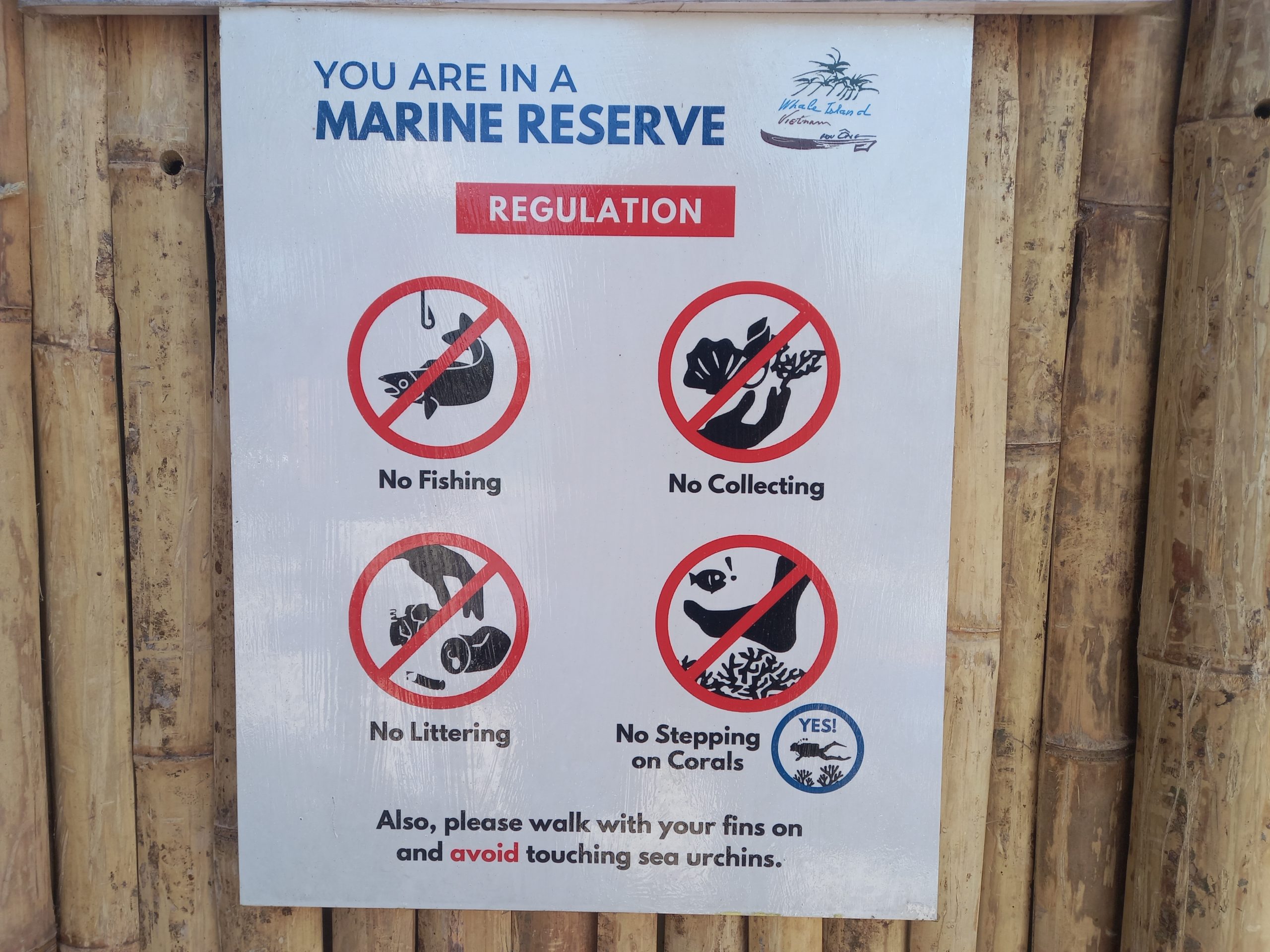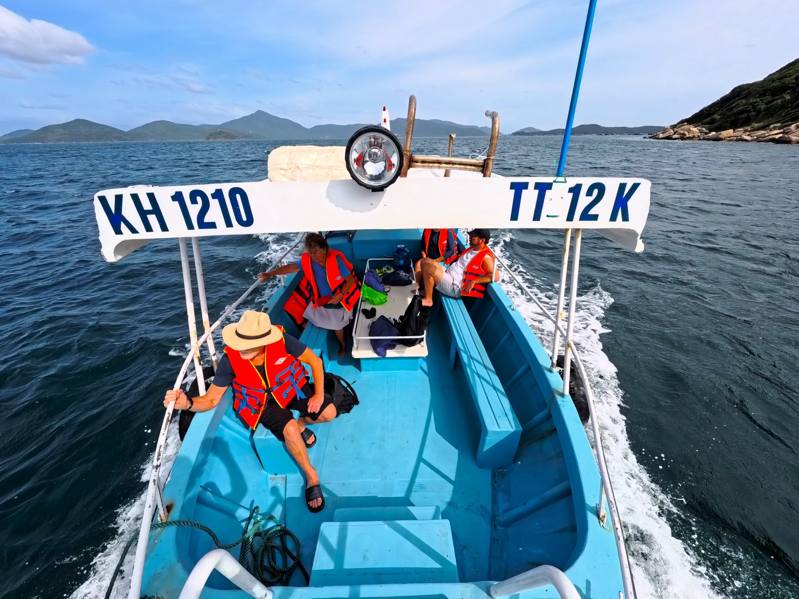 Whale Island is only accessible by boat. Getting there requires a bit of pre-planning: it’s not the kind of place you can just show up at on the spur of the moment. Firstly, you need to get to Đầm Môn Port (Bến Tàu Đầm Môn), located halfway along a scenic peninsula jutting south into the ocean 110km north of Nha Trang and 55km south of Tuy Hòa. Both Nha Trang and Tuy Hòa have airports with regular flights to/from domestic hubs, such as Hồ Chí Minh City and Hà Nội. Whale Island can arrange transfers between Nha Trang’s Cam Ranh Airport (2,100,000vnđ, 3 hours) or Tuy Hòa Airport (1,500,000vnđ, 90 minutes). There’s also a twice-daily shuttle between the Rainbow Divers Center in Nha Trang and Đầm Môn Port ($25). Alternatively, you can arrange your own transportation to Đầm Môn, such as using a ride-hailing app like Grab or Xanh SM, or riding there yourself by bicycle or motorbike (there’s a parking garage near the port). Note that transfers should be booked 2 days in advance through Whale Island staff.