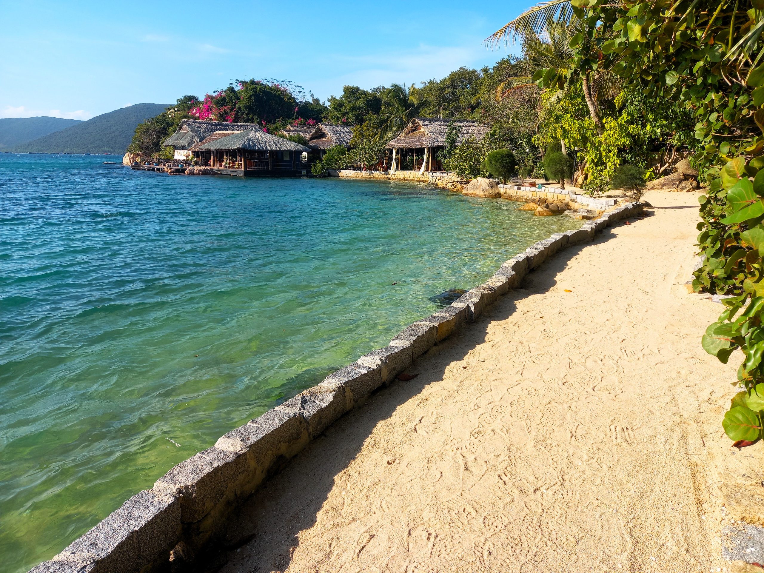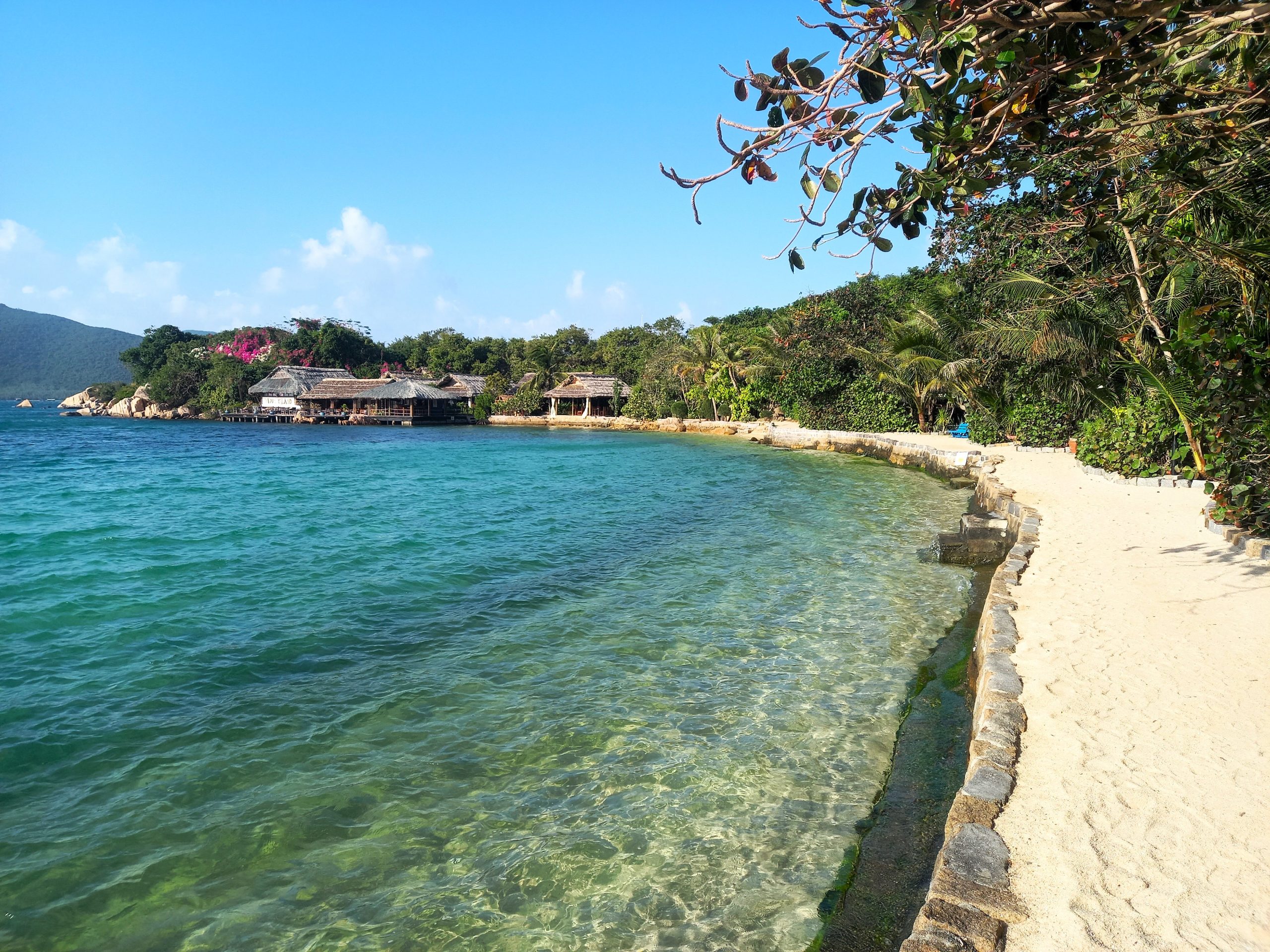 Located in a highly scenic bay, Whale Island is enclosed to the north, south and east by a long, mountainous promontory jutting into the sea from the mainland; to the west the large, jungle-clad, boulder-strewn island of Hòn Lớn looms. Whale Island is small – just 800m at its widest and 1.2km at its longest – but rugged and green. Apart from the resort, the island is entirely uninhabited. There are no cars, motorbikes, villages or shops. Formerly under military administration, Whale Island explicitly describes itself as an ‘eco-friendly beach resort’ with a ‘fully sustainable energy model relying entirely on solar power’ provided by its own solar farm. The resort is committed to protecting the natural environment and supporting the local community. There’s no air-con, no TV, swimming pool or telephone, and Wi-Fi is only available in the bar/restaurant area. Staff are all local. Single use plastic is discouraged and so too is, of course, littering. The main beach and most of the rest of the island are kept clean by Whale Island staff (and guests too, hopefully), but not everyone in this beautiful bay sees the maintenance of the natural environment as a priority.