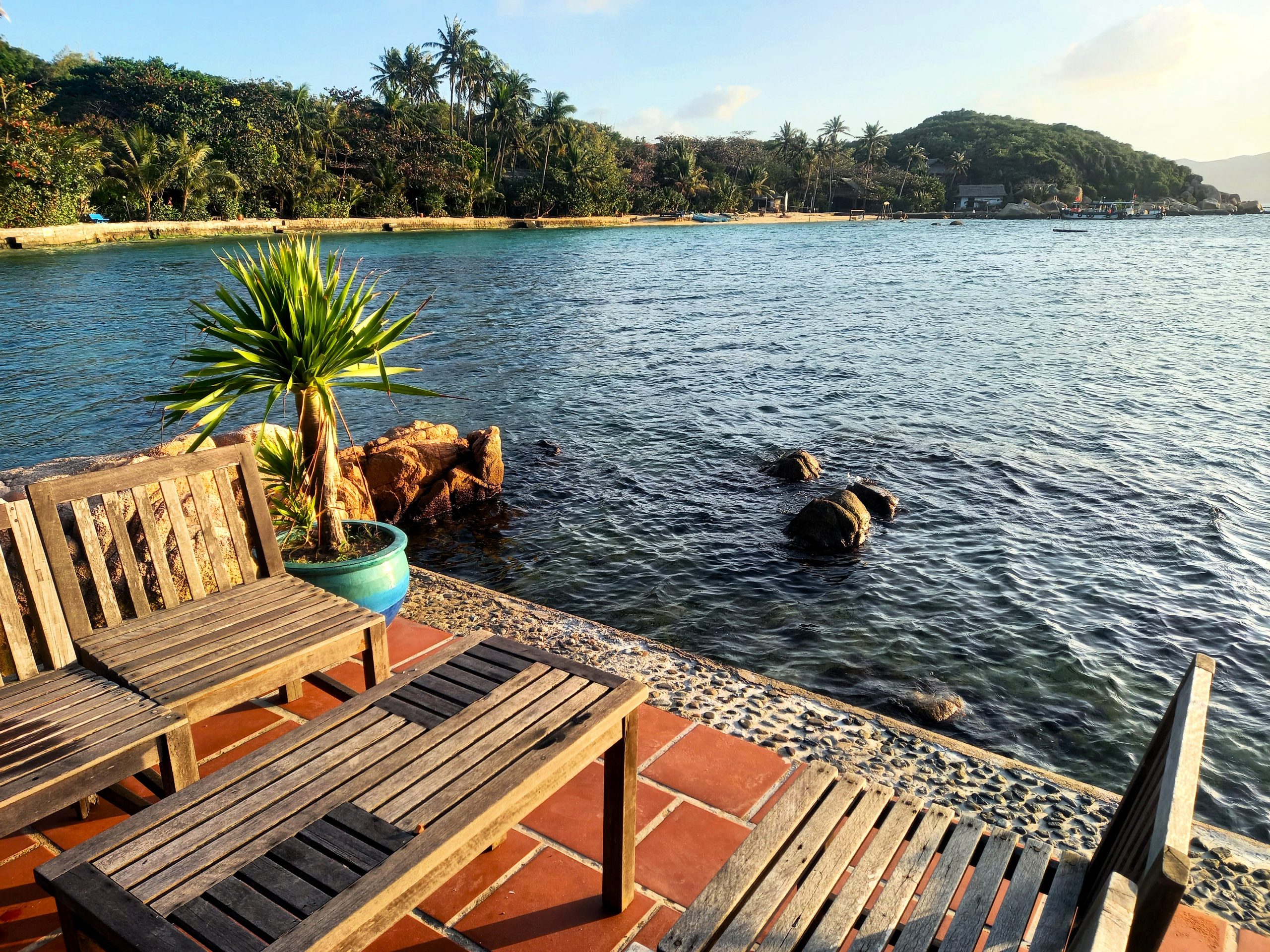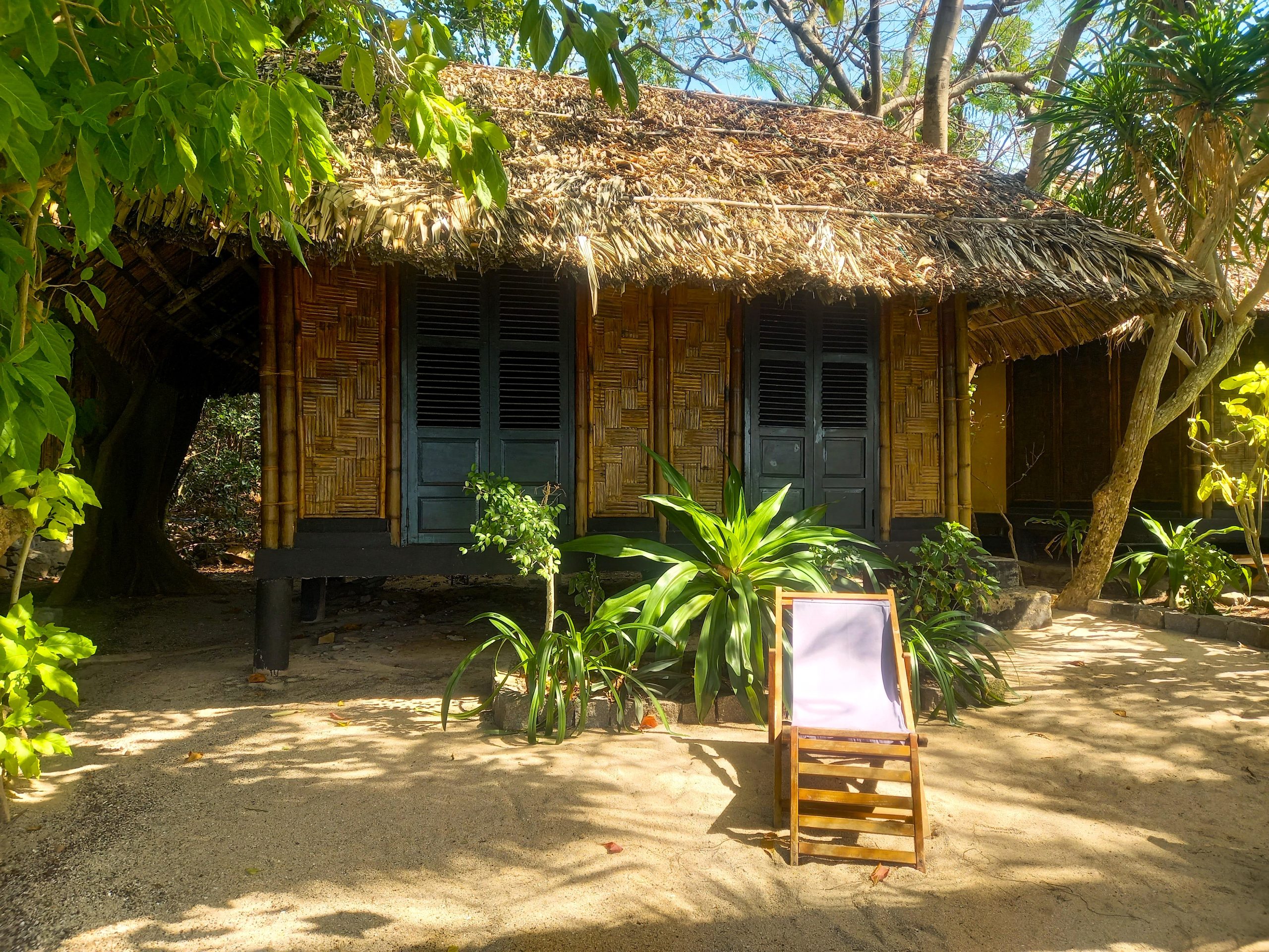 With just over 30 rooms scattered along the beachfront and hillside, accommodation on Whale Island is simple, tasteful and attractive but quite basic considering the rates. Designed to blend in with the natural setting, the vast majority of rooms are single-storey bungalows of bamboo, wood and thatch with tiled floors and an outdoor stone patio raised above the sand or garden. Décor is restrained and plain with occasional nods to local Cham culture in the form of motifs and carvings. In much the same way that the fishermen and plantation bungalows at Mango Bay used to function, rooms are designed to be self-ventilating. There’s no air-conditioning, but there are floor and ceiling fans and the shutters on the doors and windows can be left fully open to the cool night breeze thanks to in-built mosquito netting, allowing the fresh air to enter the room while keeping the bugs out. Personally, I love this kind of setup. However, during my visit, it seemed that most guests simply kept all their doors, windows and shutters closed at all times. Several different room types are available and there are also various deals, including half- and full-board, dive-and-stay packages, and more. It’s worth spending some time before deciding on which room type and package best suits your needs and tastes. Check rooms and rates on Agoda.com or the Whale Island website or email.