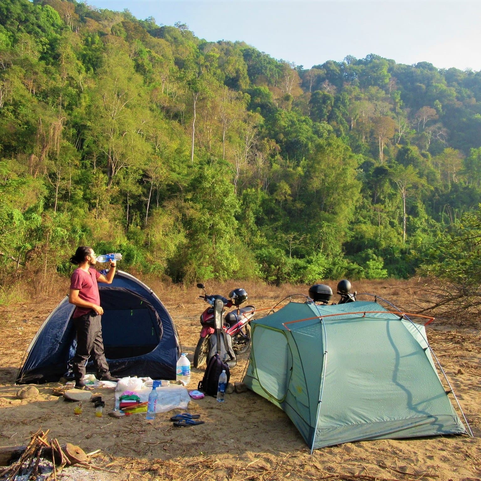 The most important thing to bring is water. You can buy 1.5 litre bottles of drinking water in pretty much any shop, shack, on roadside stall in Vietnam. But, for camping, a better idea is to find a shop selling big 5-6 litre bottles of water. Strap one of these on the back of your motorbike in addition to carrying a couple of 1.5 litre bottles. This should be enough water for two people camping for one day/night, or even two nights if you use it sparingly. It’s surprising how much water you use: making coffee or tea, cleaning utensils, making noodles, brushing your teeth, and drinking.